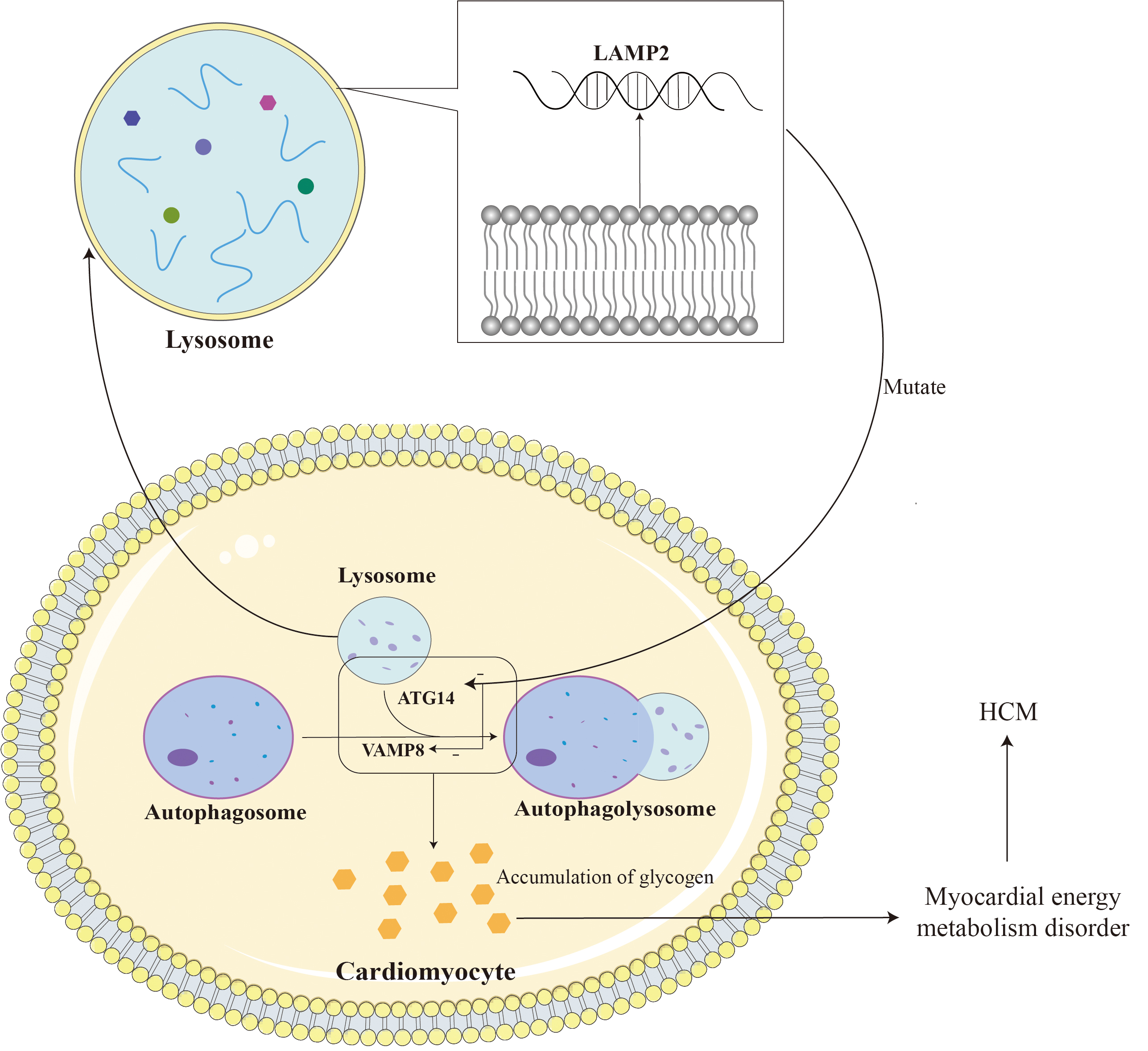 Fig. 3. LAMP2 is located on the lysosomal membrane and assists in the fusion of lysosomes and autophagosomes. The mutation leads to impairment of myocardial autophagy by reducing the fusion of lysosomes and autophagosomes, leading to glycogen accumulation and ultimately HCM. LAMP2, lysosomal-associated membrane protein 2; ATG14, autophagy-related protein 14; VAMP8, vesicle-associated membrane protein 8. Adobe Illustrator (Adobe Inc., San Jose, CA, USA).