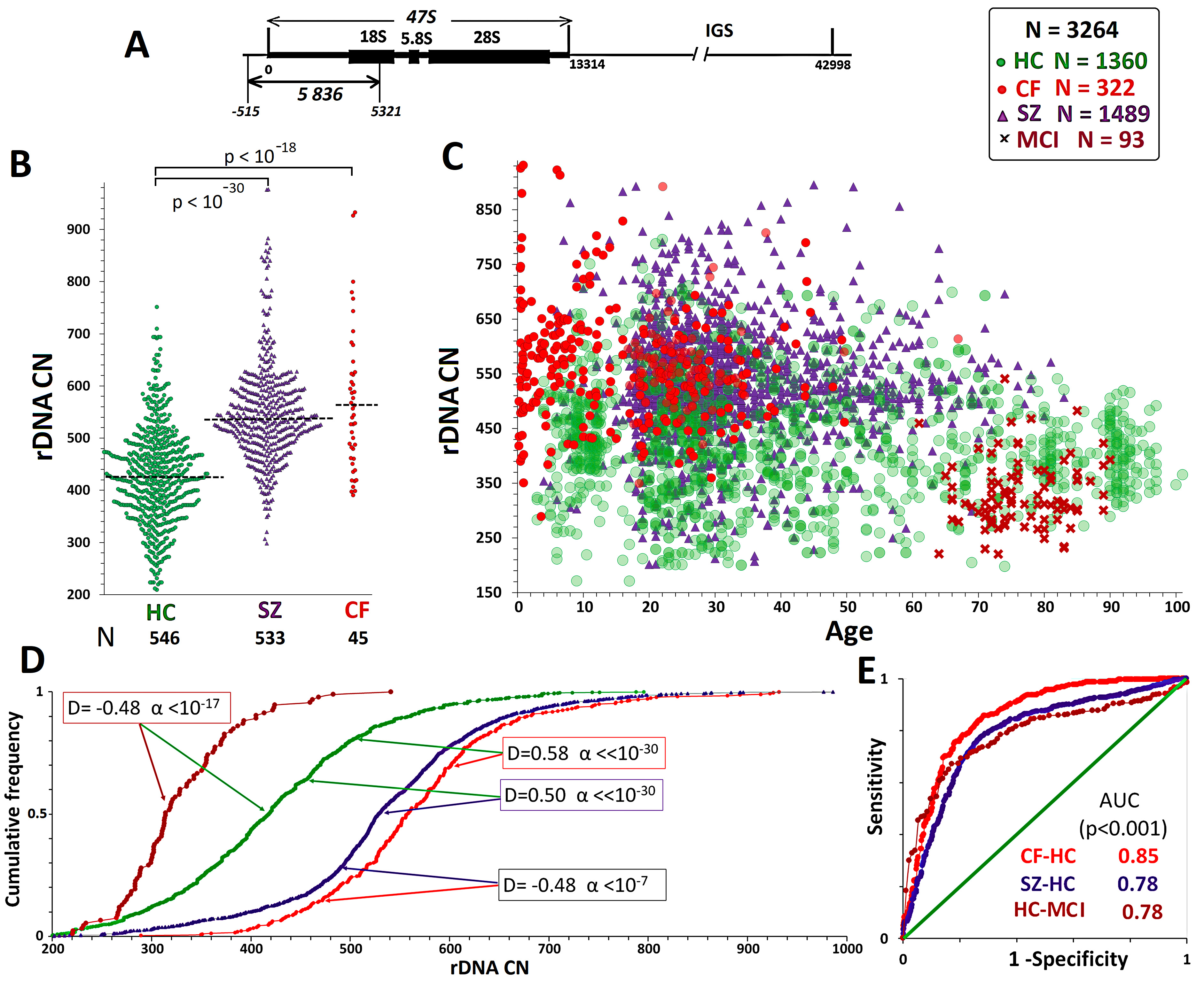 CV, coefficient of variation; CF, cystic fibrosis; HC, healthy control; MCI, mild cognitive impairment; rDNA, ribosomal DNA; SZ, schizophrenia; y.o., year old; CN, copy number.
