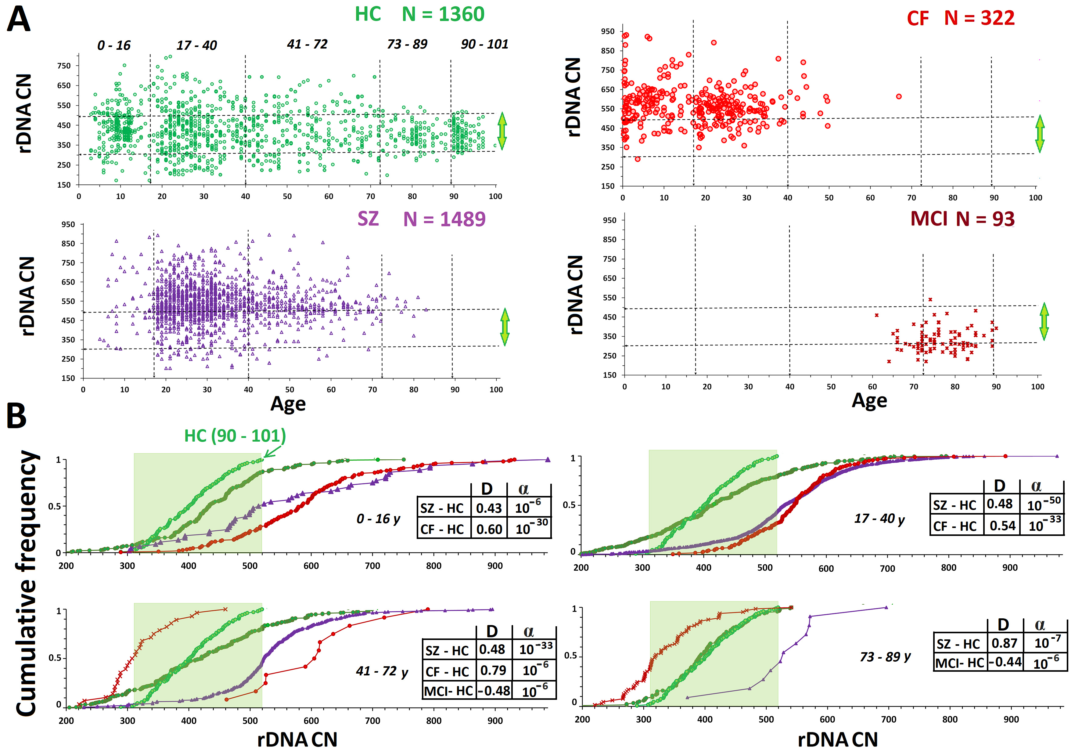 Fig. 2. Analysis of rDNA copy number variants (CNVs) in the HC, CF, SZ, and MCI groups. (A) Analysis by age of rDNA CN in the HC, CF, SZ, and MCI groups. The vertical dotted lines divide the five age subgroups. The horizontal lines divide the subgroups with high (