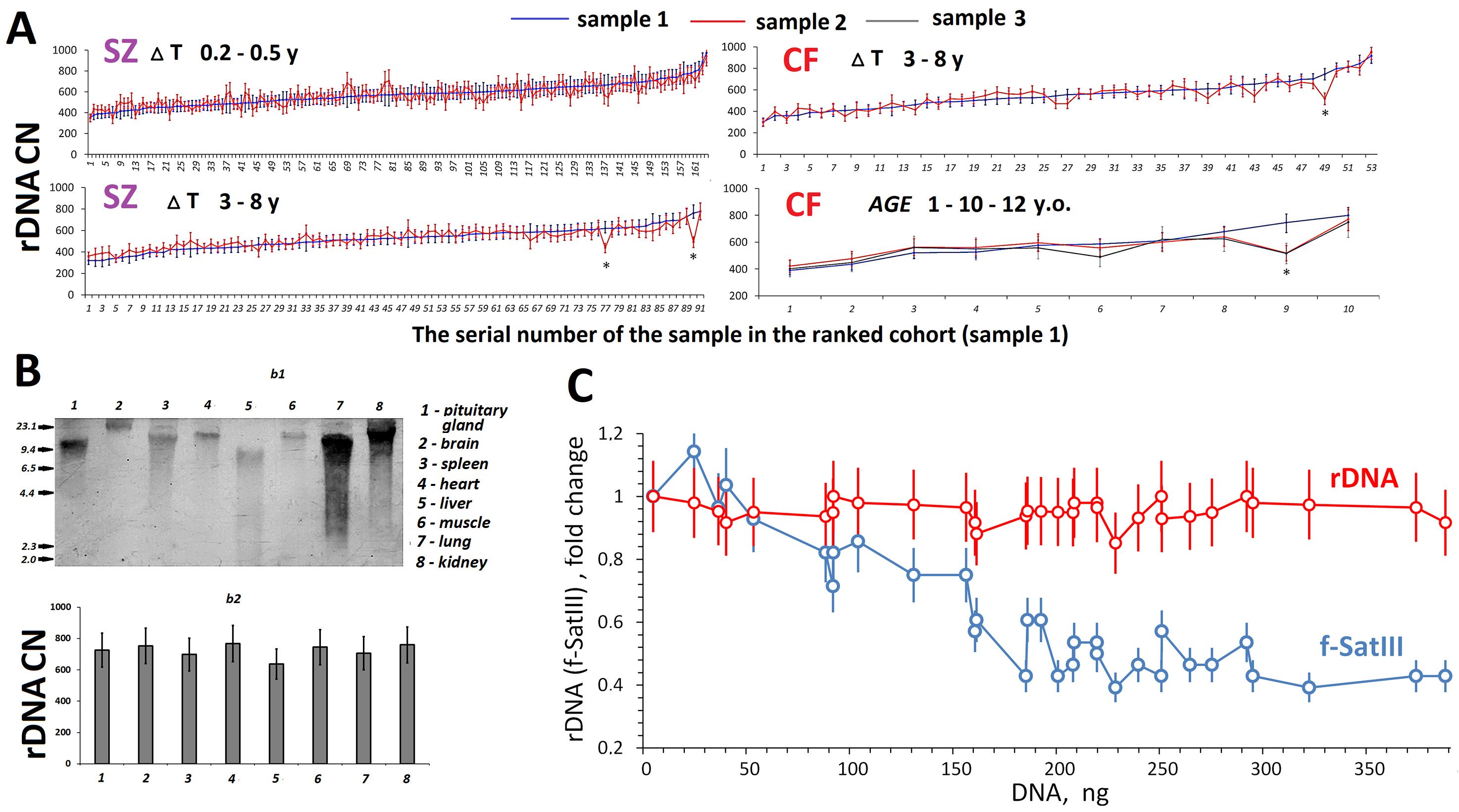 SZ is a multifactorial disease with a heritable component of 70–80% [68]. CF is a monogenic disease caused by mutations in the cystic fibrosis transmembrane conductance regulator (CFTR) gene on chromosome 7 [69, 70]. An association between the pathology and high levels of oxidative stress and DNA damage in primary and cultured cells of the patients has been reported for both SZ [45, 71, 72, 73, 74] and CF [75, 76, 77]. The elevated rDNA CN in the genomes of these completely different patient groups is intriguing and requires additional experimental corroboration and a greater understanding. There are no data in the literature on changes in rDNA CN in the same individuals over the course of their life. In addition, data on the possible heterogeneity of cells of different organs of one organism or cells of one cell population according to the rDNA CN parameter for humans are extremely scarce. In the present study, the following four groups were assessed. (1) We additionally quantified rDNA in 1124 DNA samples. Batches of DNA samples from different groups (healthy control (HC), SZ, and CF) were isolated from blood and analyzed within the same experiment to directly confirm the difference in rDNA CN in the genomes of controls and patients. (2) For the first time, rDNA CN was identified in the DNA isolated from the leukocytes of 105 long livers (90–101 years old). (3) For the first time, we monitored the changes in rDNA CN in leukocytes over several years in diseases that are accompanied by chronic oxidative stress (SZ and CF). (4) The variation in rDNA CN in eight different organs of the same patient and in the cells of the same fibroblast population was studied for the first time.