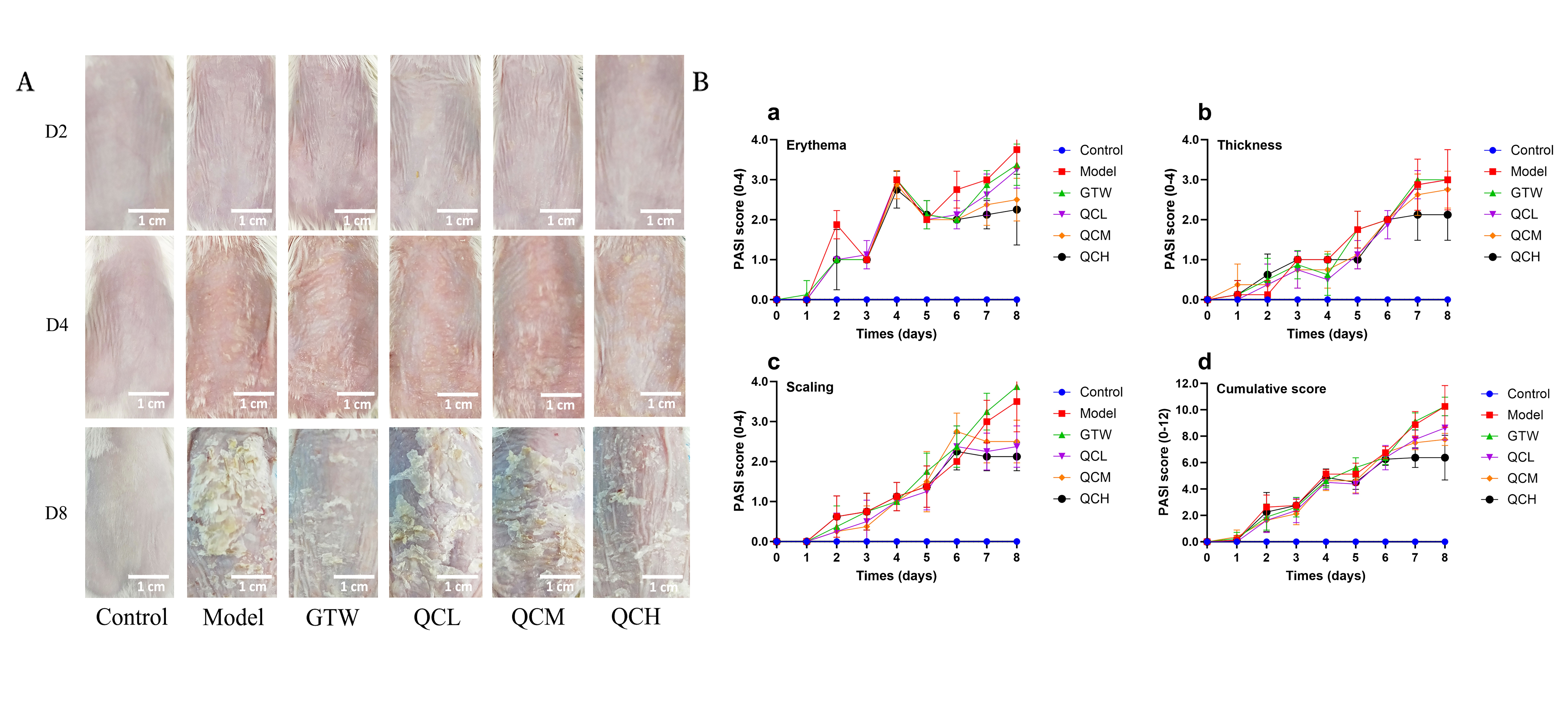 Fig. 1. Quercetin reduced the IMQ-induced psoriasis skin lesions. (A) Map of stage changes of target lesion on the back of mice (Scale bar = 1 cm) (B) PASI scoring trend (n = 6). B-a: Erythema PASI scores; B-b: Thickness PASI scores; B-c: Scaling PASI scores; B-d: Total PASI scores. IMQ, Imiquimod cream; PASI, Psoriasis Area and Severity Index; GTW, positive control group; QCL, low-dose quercetin; QCM, medium-dose quercetin; QCH, high concentration of quercetin.