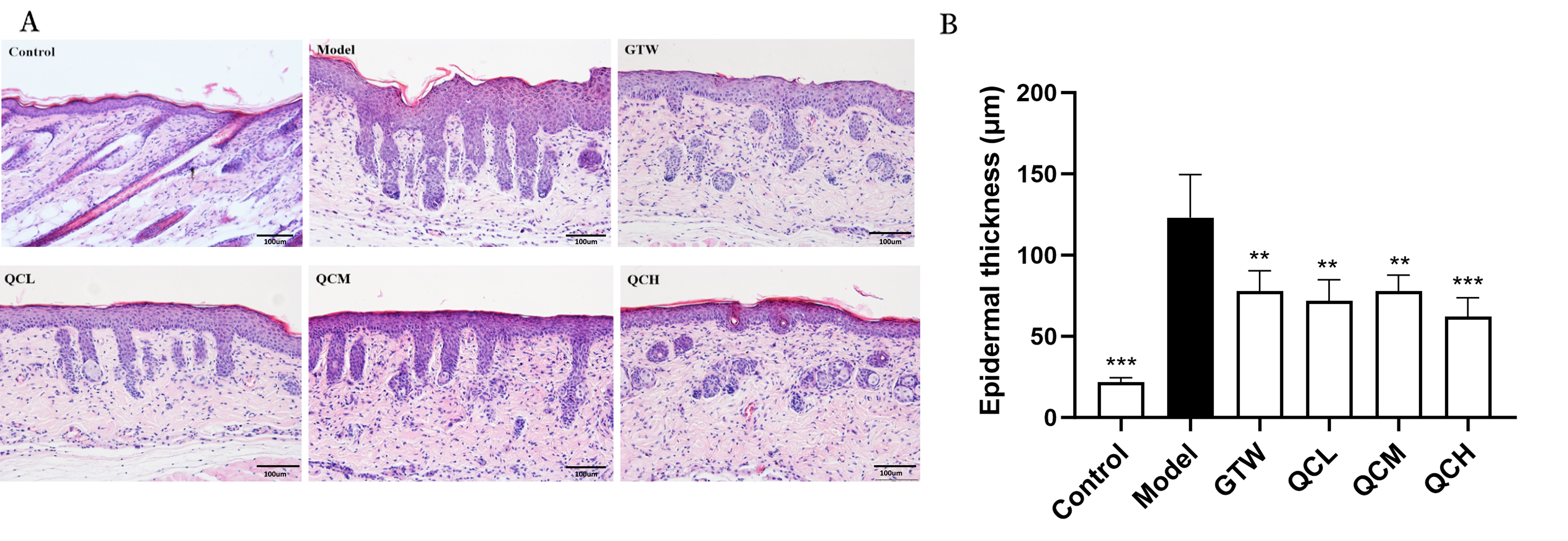 Fig. 2. Quercetin reduced the IMQ-induced psoriasis skin lesions on pathology. (A) Hematoxylin-eosin staining of the skin in control, model, GTW, QCL, QCM, and QCH group (HE, 200