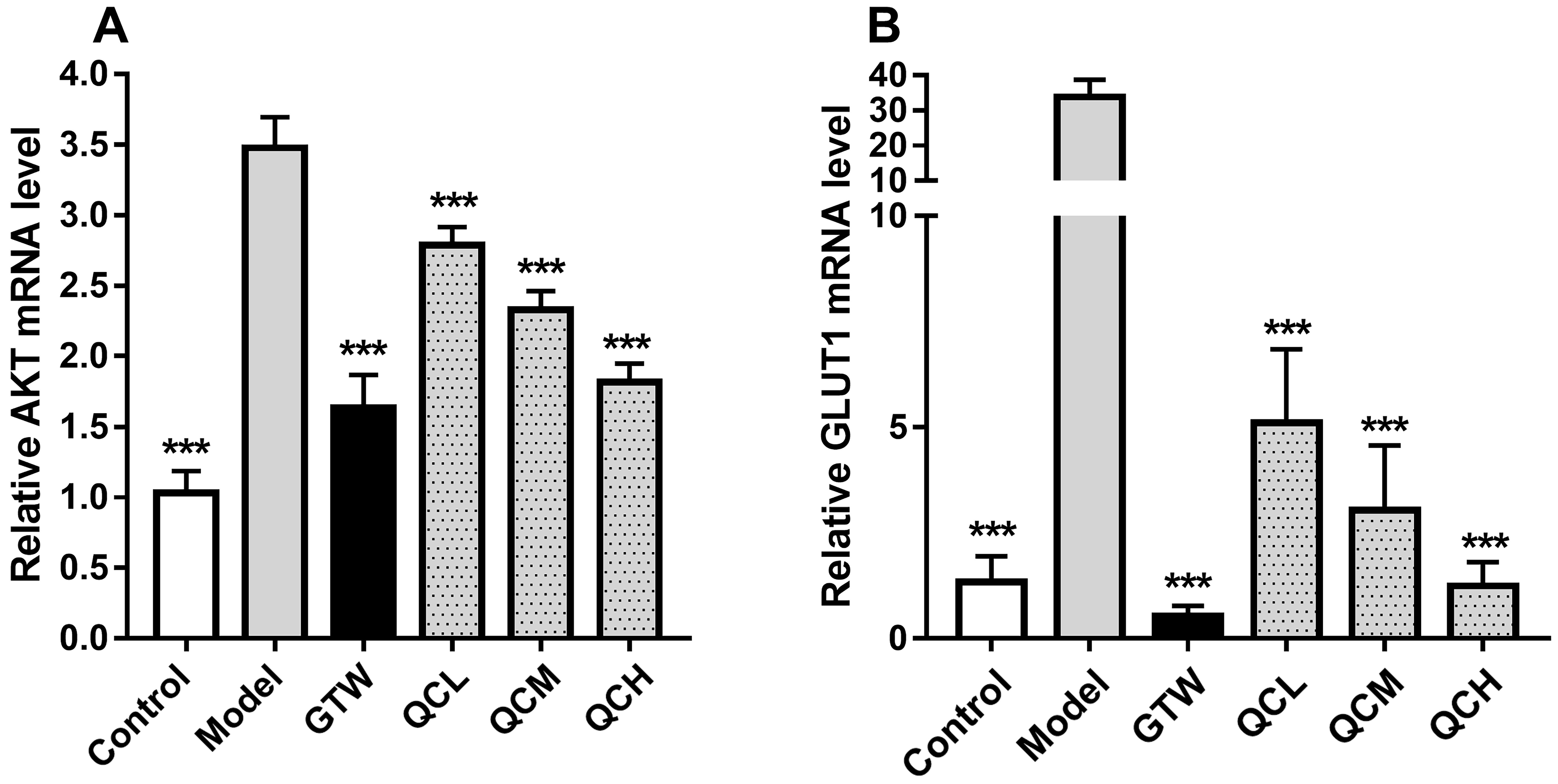 Fig. 3. Quercetin decreased the expression of Glut1 mRNA and Akt mRNA in target lesions of mice. (A) Expression of Akt mRNA in the skin lesions of mice in each group. (B) Expression of Glut1 mRNA in the skin lesions of mice in each group. ***p