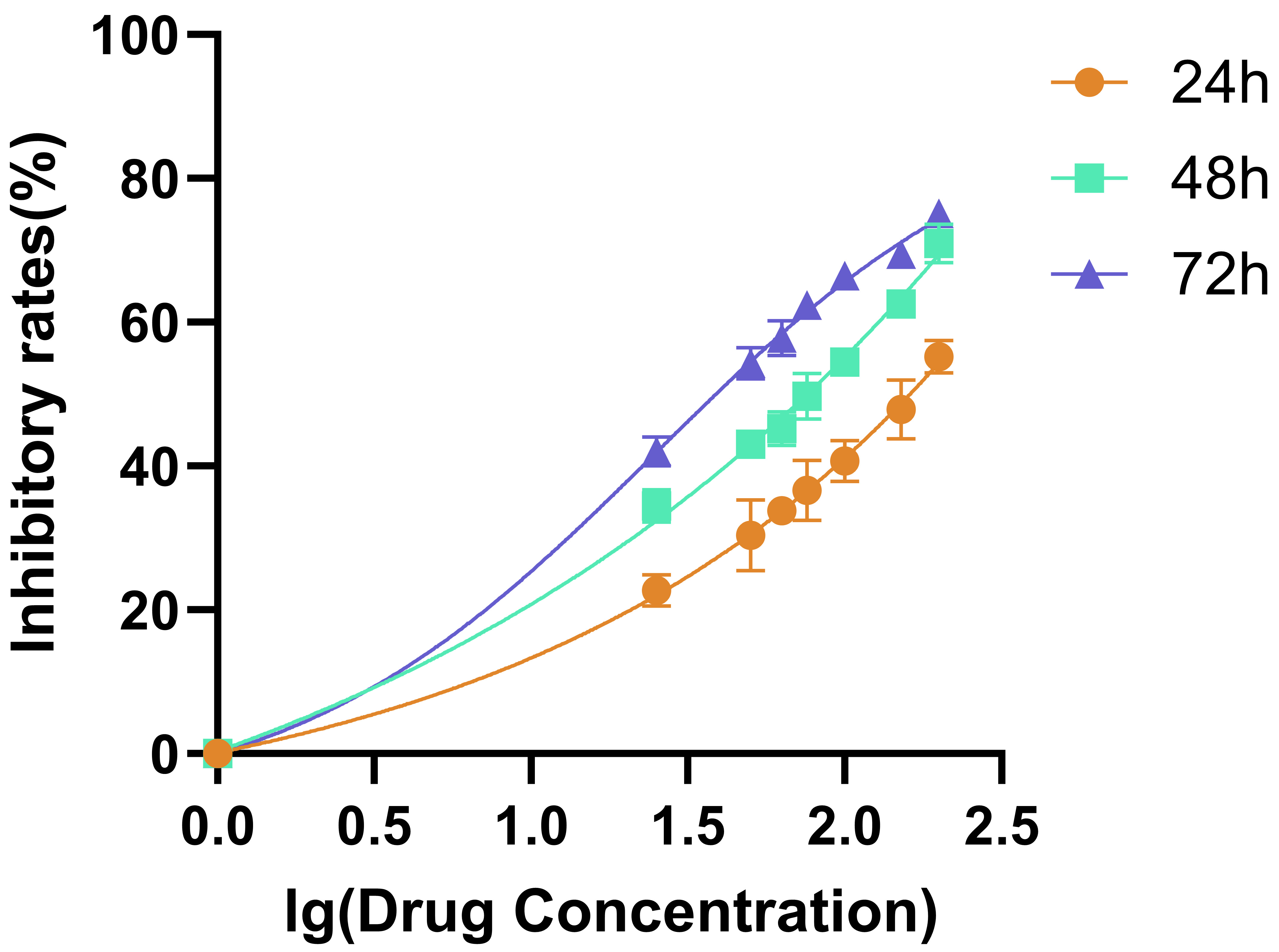 Each set consists of six duplicates. Following the addition of the medication, curing at 37 °C Incubate with 5% CO2 for 24 hours, 48 hours 72 hours later. The intervention involving the drugs was conducted at each designated time interval, the medications were removed individually, and the wells were treated with a blank medium infused with 10% CCK-8 and maintained at 37 °C for four hours. An enzyme-linked immunosorbent assay (ELISA) reader was utilized to measure the optical density (OD) at a wavelength of 450 nm for each well. This experiment was conducted in triplicate.