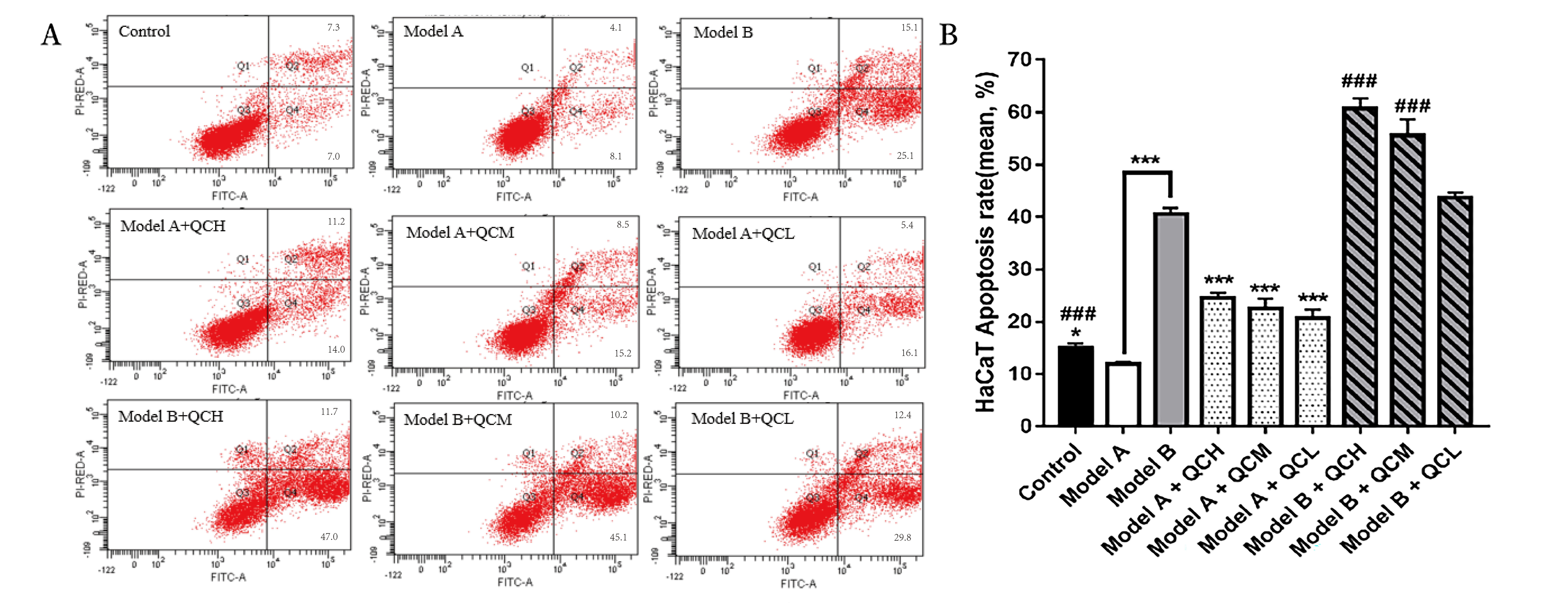 Fig. 5. Results of apoptosis rate of HaCaT cells in each group. (A) Flow cytometry of HaCaT cell apoptosis in each group. (B) Results of apoptosis rate of HaCaT cells in each group. *p