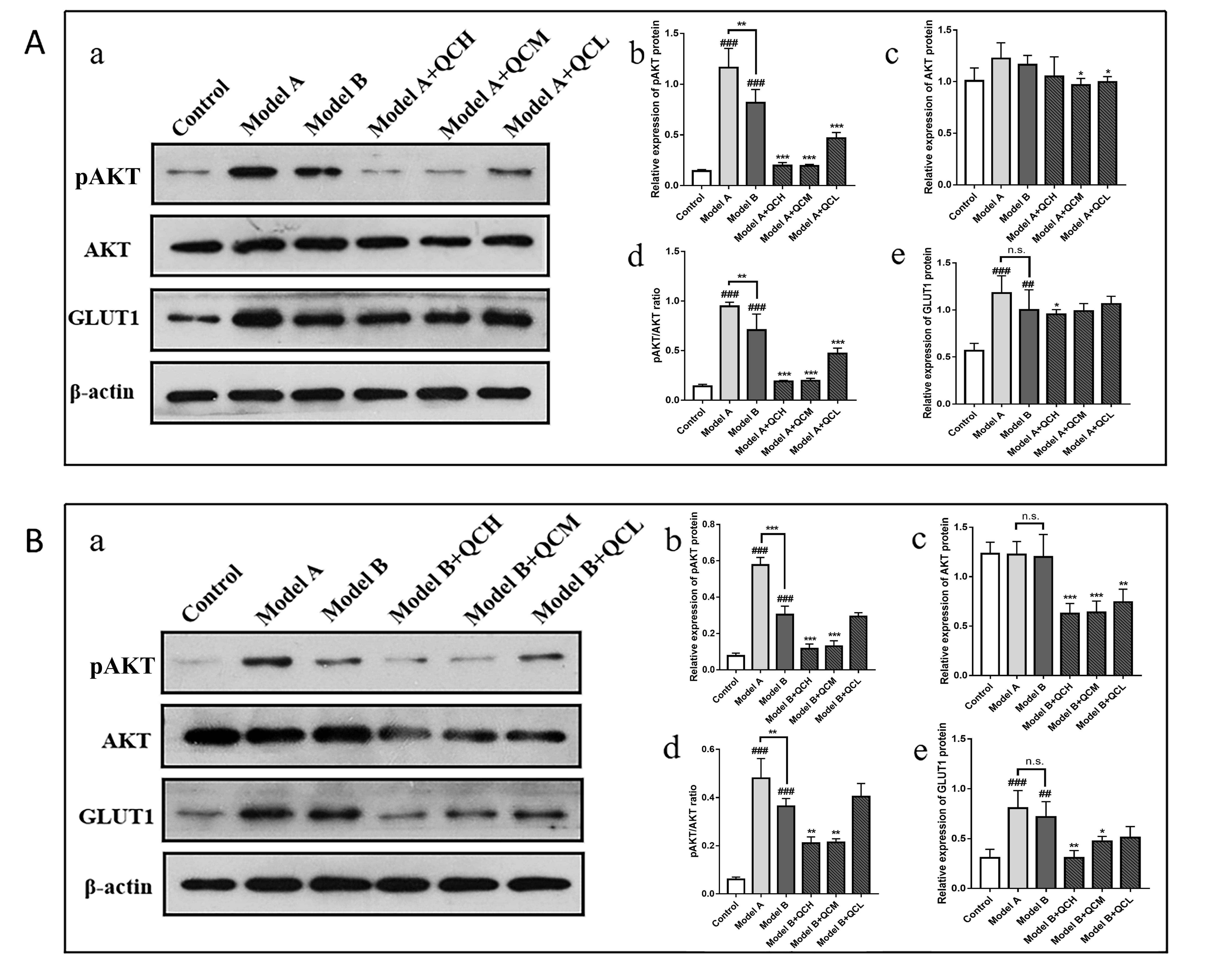 Fig. 6. Relative expression levels of AKT, pAKT and GLUT1 in HaCaT cells in each group. (A) a. the Western blot results in HaCaT cell in Model A group. b–e. the relative expression levels of pAKT,AKT,pAKT/AKT, and GLUT1 proteins in HaCaT cells of Model A groups. ##p