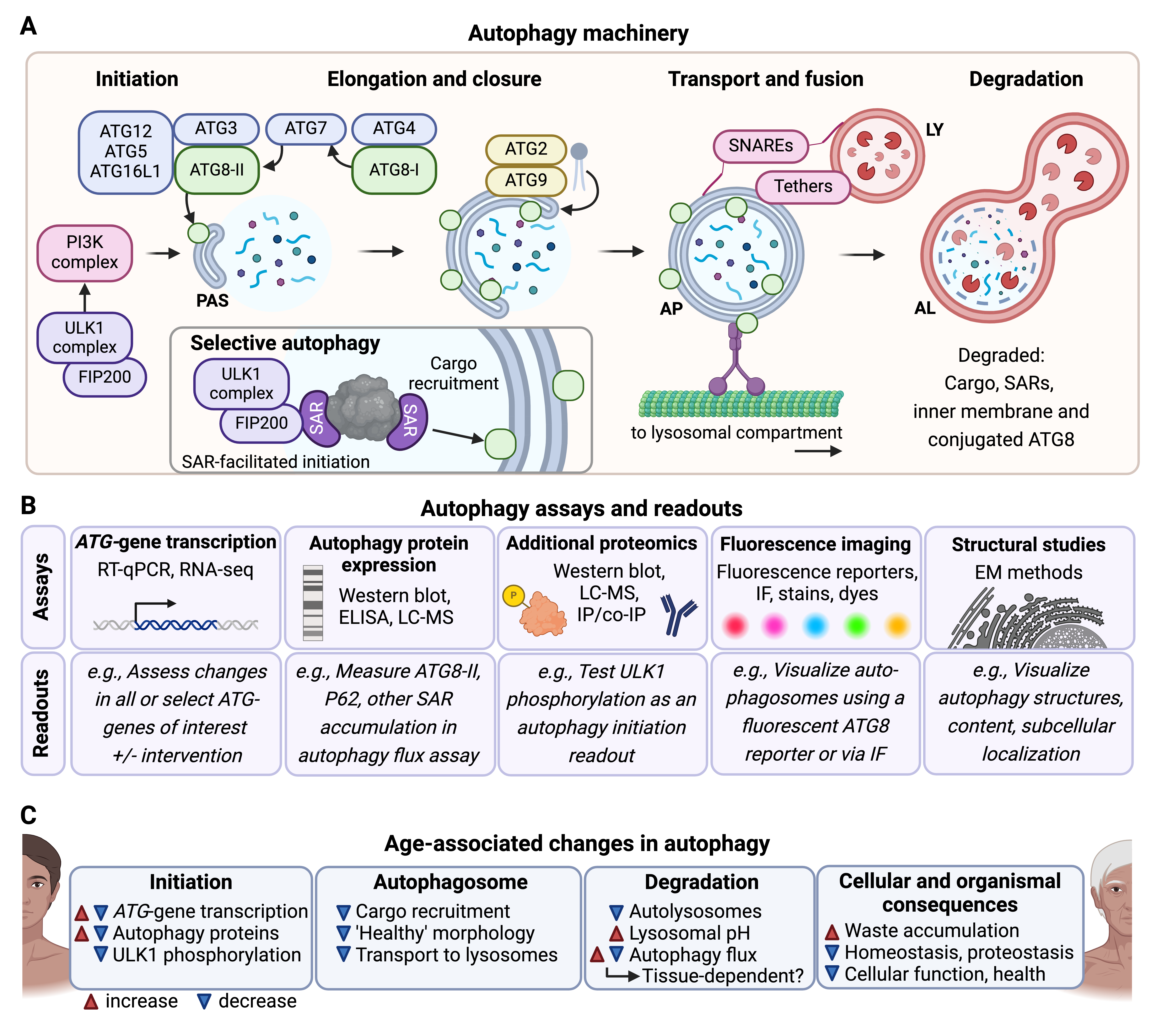 Overview of autophagy: mechanism, assays, and age-related changes in humans. (A) The multi-step autophagy process is depicted in stages: initiation, elongation and closure, transport and fusion, and degradation. In the initiation phase, the Unc-51 Like Autophagy Activating Kinase 1 (ULK1) and Phosphatidylinositol 3-Kinase (PI3K) complexes activate autophagy by recruiting key autophagy-related proteins (ATGs) to the pre-autophagosomal structure (PAS), where phagophore formation begins. During elongation and closure, ATG proteins, such as ATG3, ATG7, and ATG8, facilitate phagophore growth and closure around cargo. ATG8 is represented by green circles attached to both the inner and outer autophagosomal membranes. Selective autophagy involves the association of selective autophagy receptors (SARs) and their cargo with the ULK1 complex. SARs can interact with ATG8 proteins on the inner autophagosomal membrane. The autophagosome (AP) is then transported to the lysosome (LY), where SNAREs and tethers facilitate fusion to form an autolysosome (AL), where cargo is degraded. (B) Various biochemical, imaging, and structural assays are used to investigate different stages of the autophagy process and overall autophagy flux. These include ATG-gene transcription assays (RT-qPCR, RNA-seq) to measure changes in gene expression, protein expression assays (Western blot, ELISA, LC-MS) to quantify levels of autophagy proteins like ATG8 or SARs like p62, and additional proteomics methods (e.g., co-immunoprecipitation, IP) for investigating post-translational modifications, such as ULK1 phosphorylation. Imaging techniques, including fluorescent reporters, immunofluorescence (IF), stains, and dyes, allow visualization of autophagosomes, while structural studies (e.g., electron microscopy, EM) provide detailed views of autophagy structures, subcellular localization, and morphology. (C) Experimental evidence indicates that autophagy becomes dysregulated in aging and age-related diseases, with effects seen across different stages of autophagy. Dysregulation may manifest as changes in ATG-gene transcription, autophagosome morphology, lysosomal pH, and overall autophagy flux, contributing to waste accumulation, impaired proteostasis, and cellular dysfunction. Phenotypes that increase with age are indicated with a red arrowhead, and phenotypes that decrease with age are indicated with a blue arrowhead. Some phenotypes can change in either or both directions with age. Figure created in BioRender (https://www.biorender.com/).