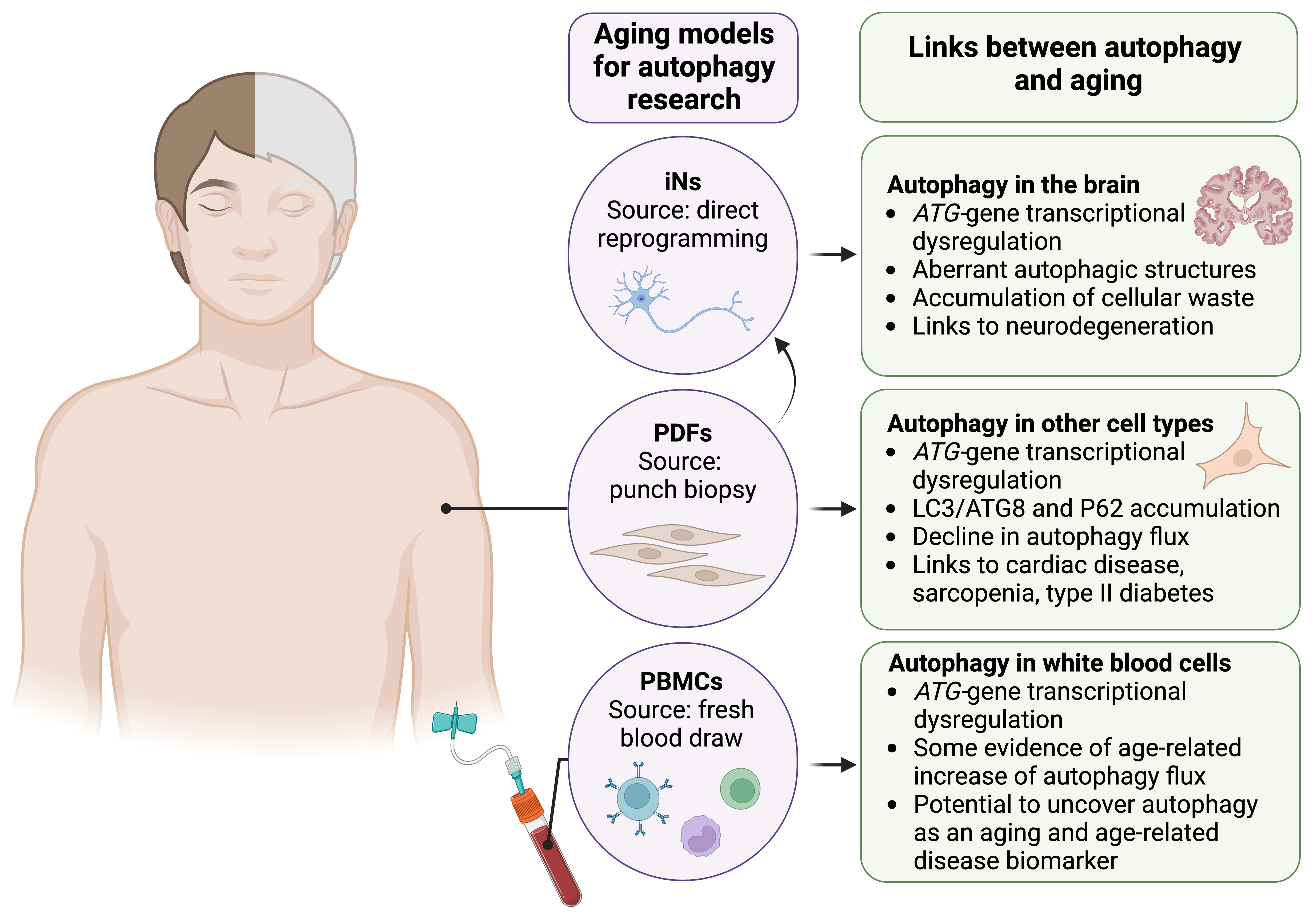 Key human cellular models for aging- and age-related disease-relevant autophagy research. Advances in human cell collection and culture have yielded cell models that largely retain aging- and chronic age-related disease-associated signatures of donors. Three key human cell models are induced neurons (iNs) generated via direct reprogramming, primary dermal fibroblasts (PDFs), and fresh peripheral blood mononuclear cells (PBMCs). Age-related changes in some autophagy readouts have been observed across human tissues (see right panels); the human cell models shown can be used to validate and thoroughly investigate the molecular mechanisms underlying age-related autophagy dysfunction, and test autophagy-enhancing interventions. ATG, autophagy-related. Figure created in BioRender (https://www.biorender.com/).