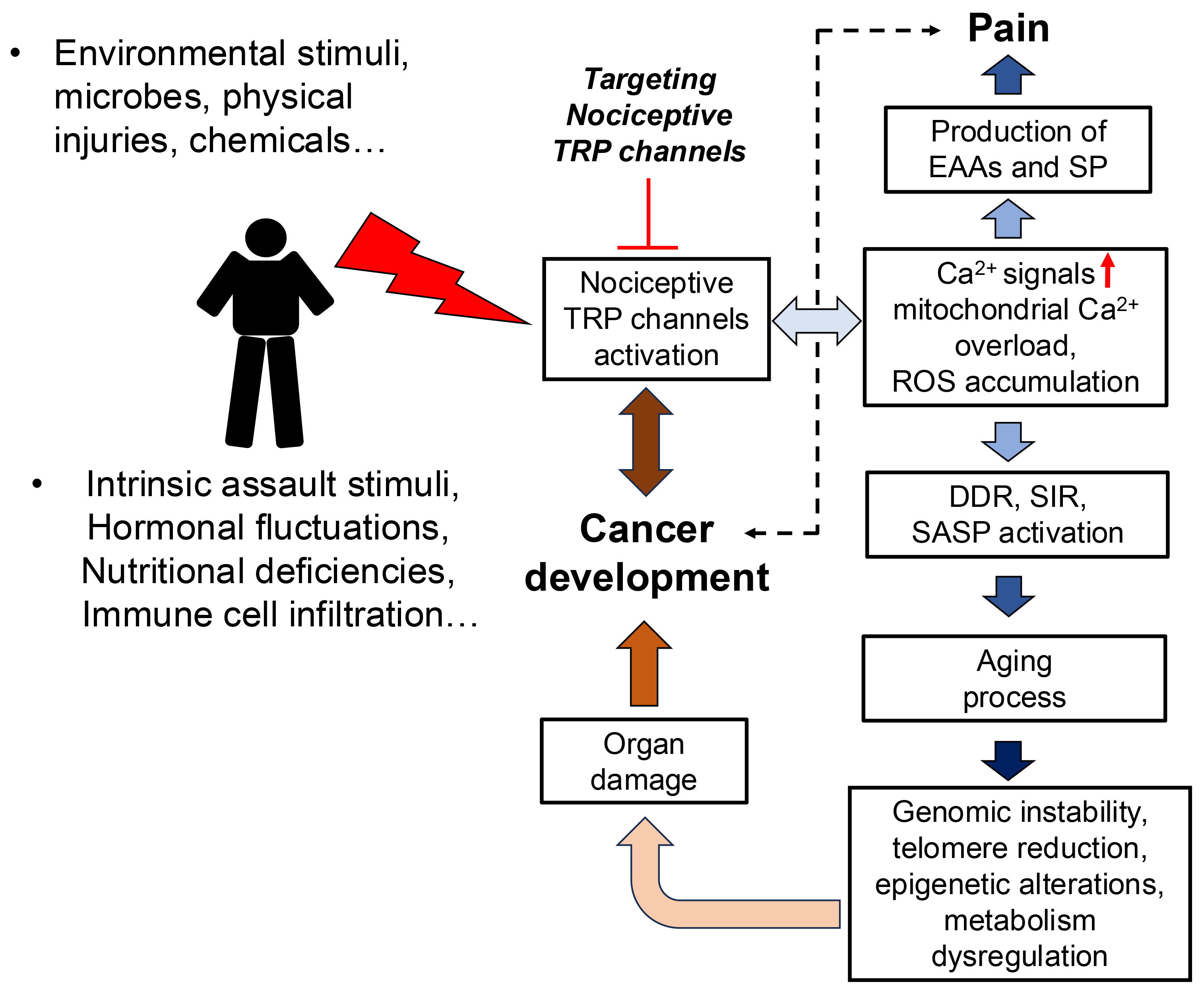 Transient receptor potential (TRP) channels are central to both carcinogenesis and advanced tumor progression [1]. Targeting TRP channel-mediated Ca2+ signaling offers a novel therapeutic approach for cancer [2]. Nociceptive signaling involves several TRP channels, including TRPA1, TRPC1/C3/C5/C6/C7, TRPM2/M3/M8, and TRPV1/V2/V3/V4, which contribute to pain perception. Interestingly, these TRP channels are implicated in carcinogenesis, where genomic instability—a crucial driver of cancer development—is linked to Ca2+ signaling-regulated aging process [3]. While nociception may play a role in cancer development, the correlation between pain and cancer progression remains largely unexplored.