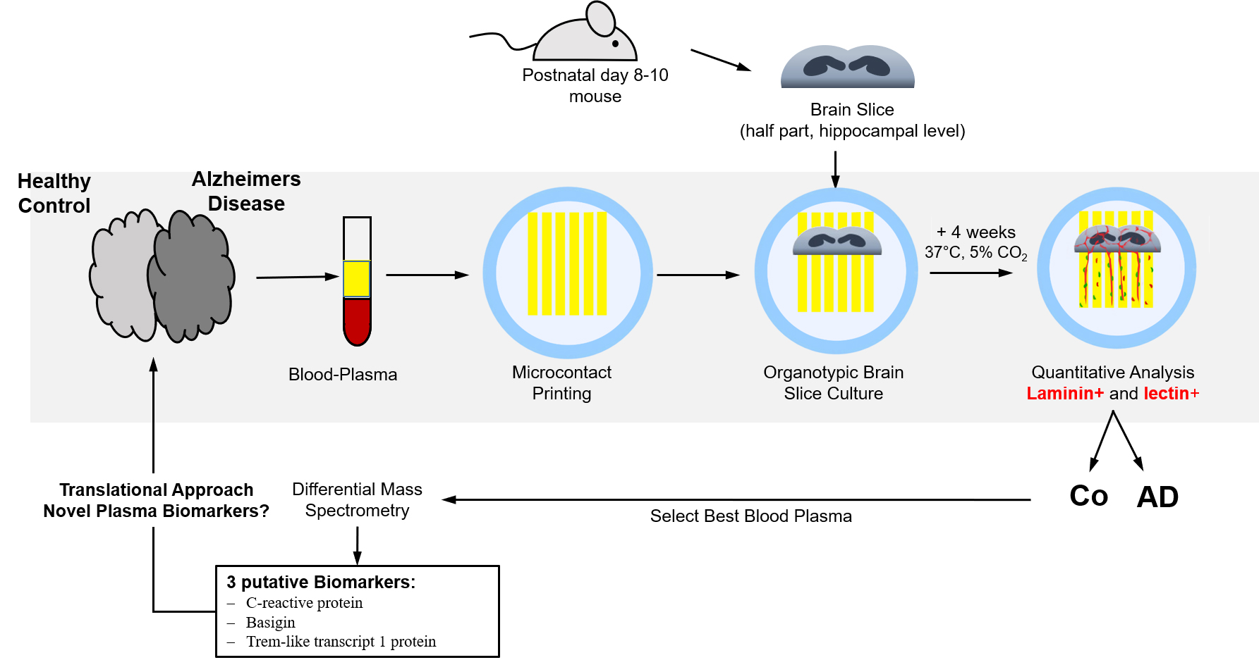 In the present study, we coupled organotypic mouse brain slices to microcontact prints loaded with human plasma. We found that plasma from AD patients enhanced the migration of laminin+ and lectin+ EC. Using the most promising samples, we identified three potential biomarkers using differential mass spectrometry: C-reactive protein, basigin and trem-like transcript-1 protein. Based on our results we hypothesize that inhibition or the activation of one of these 3 molecules may influence endothelial cell migration and possibly formation of new vessel. The next steps to identify the potential role of these 3 plasma biomarkers in AD will be: (1) we will develop a sensitive human ELISA to analyze these 3 factors in plasma to demonstrate a significant difference between healthy controls and AD and (2) we will also generate recombinant human proteins and load these proteins into the µCP lanes to proof that indeed migration of EC and vessel formation is modified. Our present study is an innovative novel approach to find new human biomarkers in a mouse cell culture model.