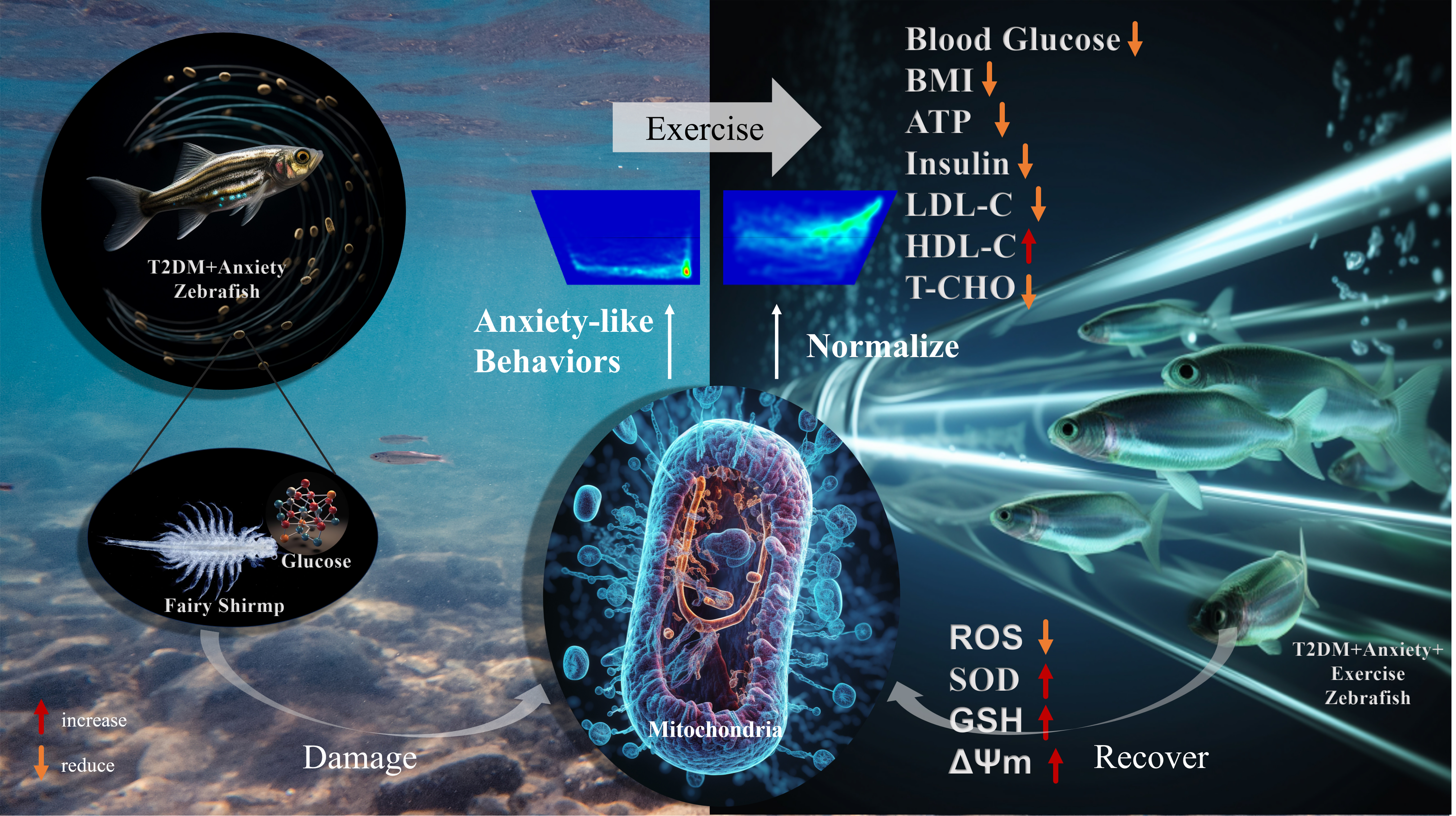 Swimming training (ST) is a non-drug intervention that can reactivate mitochondria damaged by hyperglycemia [9]. Different structured exercise training modes, such as ST, resistance training, high-intensity interval training, and gentle exercise can result in different outcomes [10, 11, 12, 13]. Swimming is a low-impact aerobic exercise involving multiple muscle groups. It can simultaneously promote calorie consumption, fat metabolism, and cardiovascular health. Thanks to their innate swimming propensity, zebrafish serve as an ideal model for voluntary exercise study [14]. They possess similar insulin regulatory mechanisms to those found in mammals, and share neurochemical features with humans, making them suitable for T2DM and neuropsychiatric research [15]. Notably, zebrafish possess neurotransmitters, hormones, and receptors similar to those present in the hypothalamic-pituitary-adrenal axis of humans. The zebrafish model has therefore been used to study various mental disorders or psychotropic drugs [16], including Alzheimer’s disease [17, 18], anxiety [19], and depression [20].