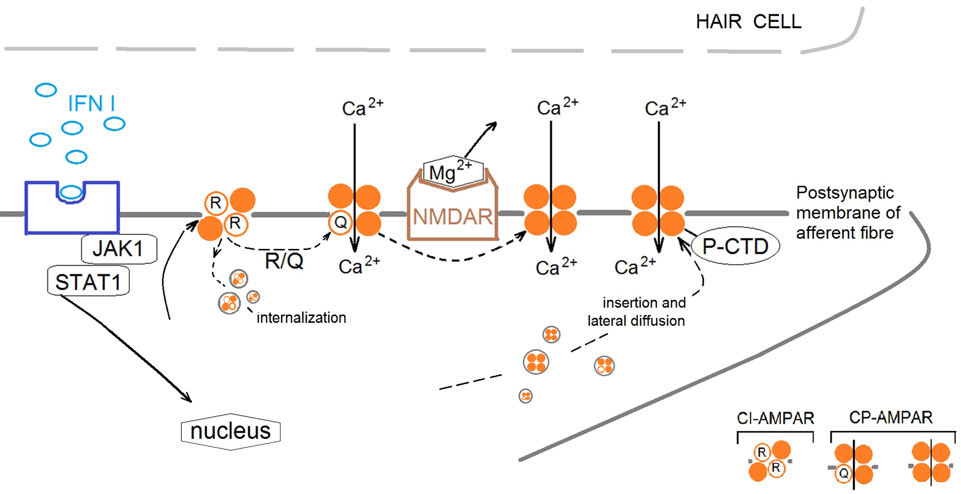 Fig. 6. Proposal mechanism of IFN type I influence on cross-talk of AMPA receptors (AMPARs) and NMDA receptors (NMDARs) in the frog vestibular epithelium. IFN initiates the restructure of the AMPAR subunit composition in the postsynaptic membrane of afferent fiber by activation Janus activated kinases 1/signal transducer and activator of transcription 1 (JAK1/STAT1) cascade. Changes in synaptic strength are accompanied by changes in the composition of AMPAR subunits in the synapse due to the movement of receptors lacking GluA2 subunits to and from the postsynaptic membrane. IFN increases the ratio of Ca2+-Permeable AMPA Receptors (CP-AMPAR) to Ca2+-Impermeable AMPA Receptors (CI-AMPAR), presumably through two mechanisms: (1) By increasing the amount of CP-AMPAR in the extrasynaptic zone and increasing traffic of CP-AMPAR into the synaptic membrane by phosphorylation of (C)-terminal domain (P-CTD). (2) By phosphorylation of transmembrane domain 2 at 607 sequence (R-Q) resulting in changing the charge of the channel pore and increase of Ca2+ entrance and/or removing CI-AMPAR from the synaptic zone by internalization. The activation of CP-AMPARs in synaptic zone leads to relieve NMDARs pore blockaded by Mg2+ to permit Ca2+ entrance into the postsynaptic membrane and initiate signaling cascades.