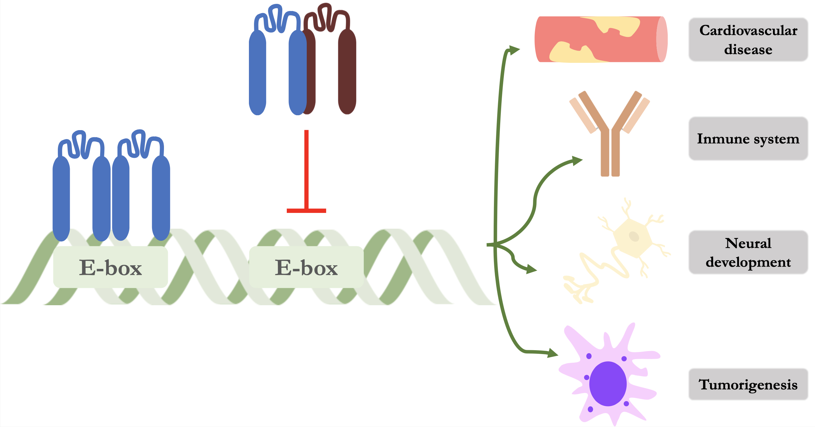 Id proteins perform their function of modulating gene expression through binding to other proteins, as they cannot bind to DNA due to the absence of a basic region adjacent to the HLH motif (Fig. 1). The main targets for binding are HLH proteins, specifically class I and II proteins [15]. E proteins (mainly E2A, HeLa E-Box binding factor (HEB) and E2-2) are representative of class I HLHs and the formation of these heterodimers prevent their physiological binding to specific recognition sites known as E-box and N-box [16]. By the formation of this heterodimer, Id proteins prevent binding and therefore repress gene transcription that regulate various cellular processes such as angiogenesis, neurogenesis, myelopoiesis, regulation of the immune system, cell growth and tumorigenesis. Class II of HLH proteins are mainly composed of myogenic (MyoD) and neural (NeuroD/Beta2) regulatory factors [17].