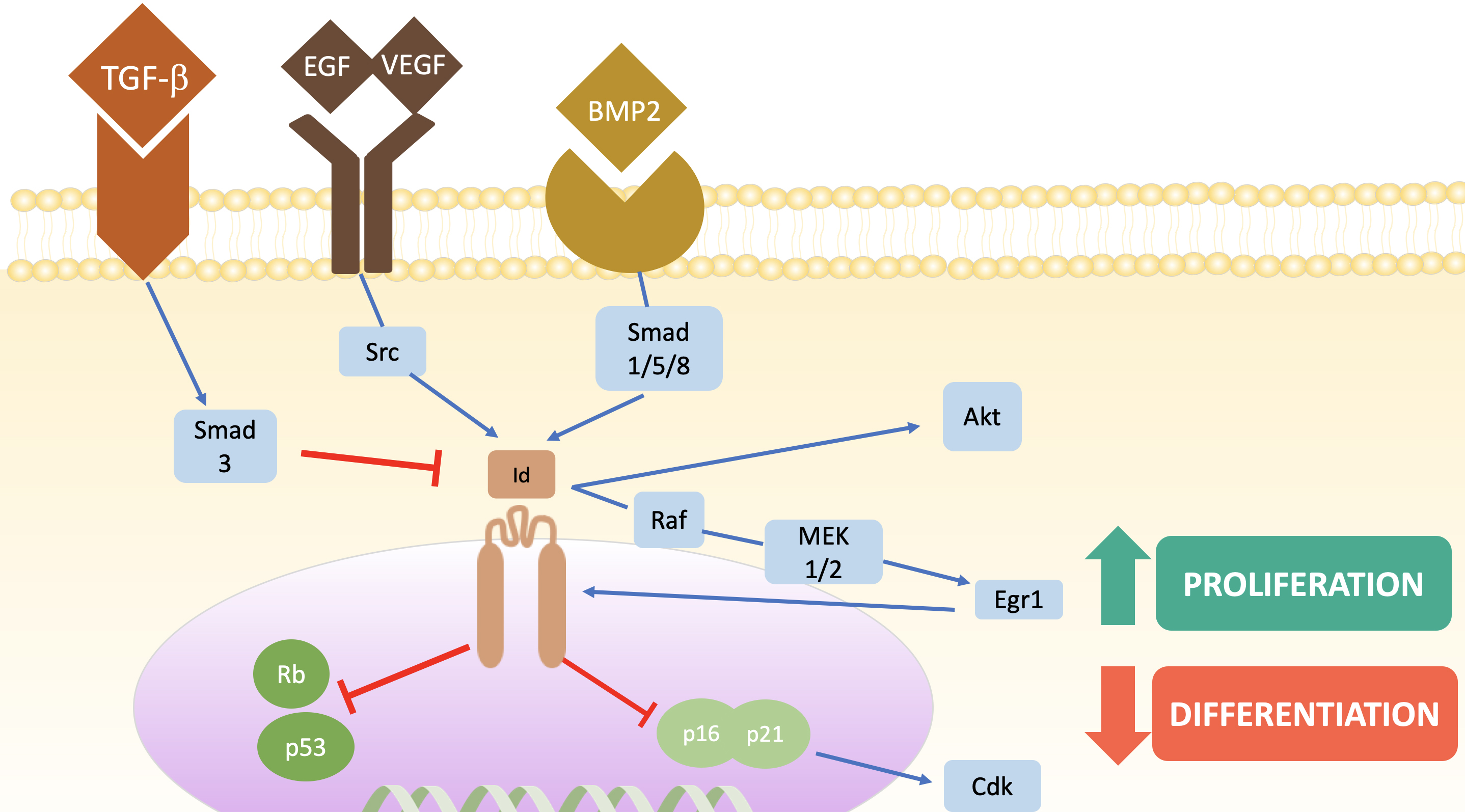 Fig. 2. Regulation of Id proteins and their main stimulation pathways. Blue arrows mean activation while red arrows represent metabolic pathway inhibition. Note that Egr1 establishes a positive feedback system, as it ultimately favours the transcription of Id proteins. TGF-