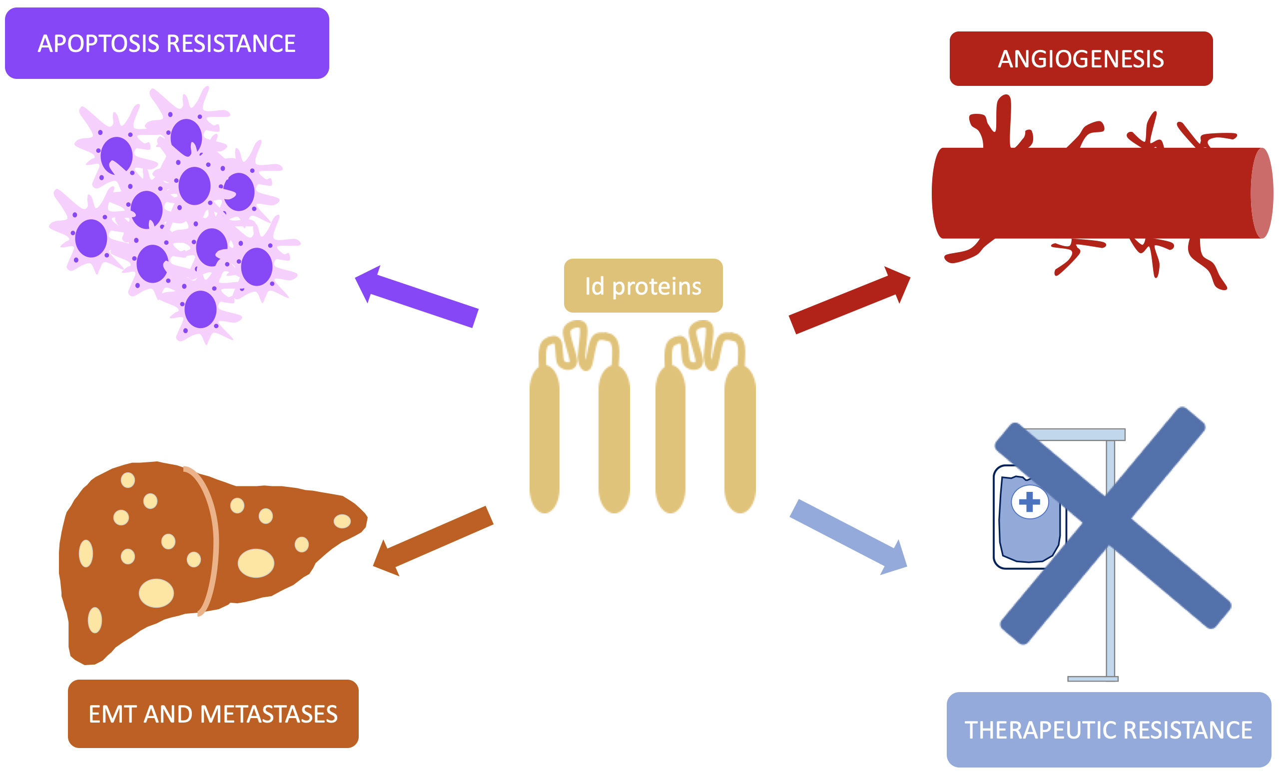 Resistance to conventional treatments is a major problem, as different types of cancer have developed strategies to counteract their cytotoxic effects. Among the cell subtypes within a neoplasm, tumor cells with stem-cell characteristics are a major focus of resistance because of their self-renewal skills and are favoured by the presence of Id proteins together with signal transducer and activator of transcription type 3 (STAT3) [65]. For example, Id1 together with c-Jun proto-oncogene (c-Jun) has been linked to resistance to etoposide-induced DNA damage in esophageal squamous cell carcinoma while in prostate carcinoma it is associated with resistance to taxane-induced damage due to Akt overexpression [24, 66]. In hepatocellular carcinoma, Id1 activates the p16/IL6 axis, favoring resistance to sorafenib, and stimulates the pentose phosphate pathway, promoting chemoresistance to oxaliplatin [67, 68]. What is more, Id1 overexpression induces resistance to 5-Fluorouracil through activation of E2F1-dependent thymidylate synthase in colorectal cancer, whereas its inhibition restores sensitivity to treatment. These findings underscore the multifaceted role of Id1 in the regulation of therapeutic resistance [69].