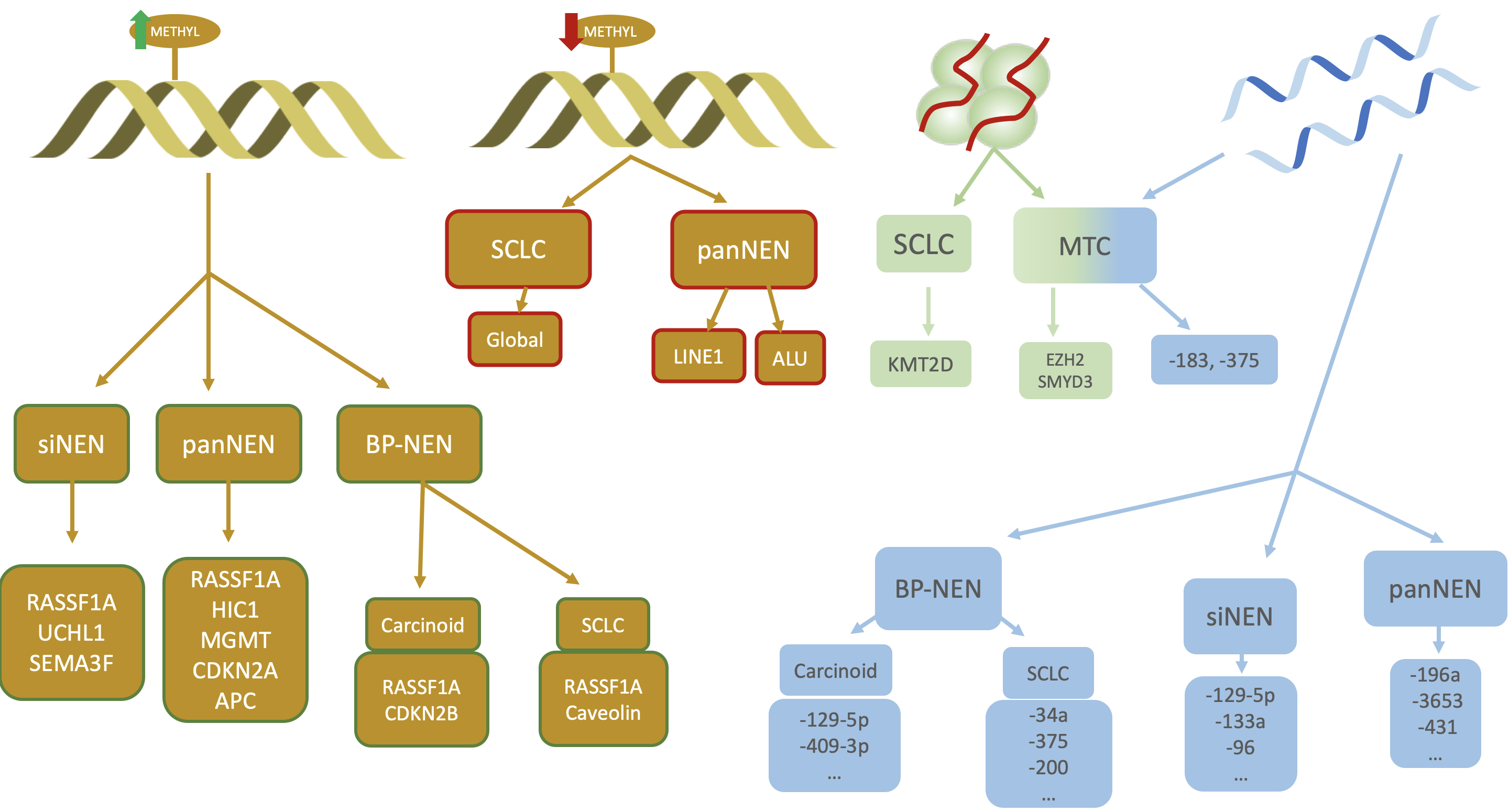 Although less frequent, DNA hypomethylation also plays a role in NENs development. Indeed, hypomethylation in long interspersed element 1 (LINE1) and Arthrobacter luteus (ALU) homolog genes, confer a lower survival and a higher tumour stage in panNENs [117, 128]. Furthermore, global hypomethylation has been described as a characteristic finding of SCLC [124, 125].