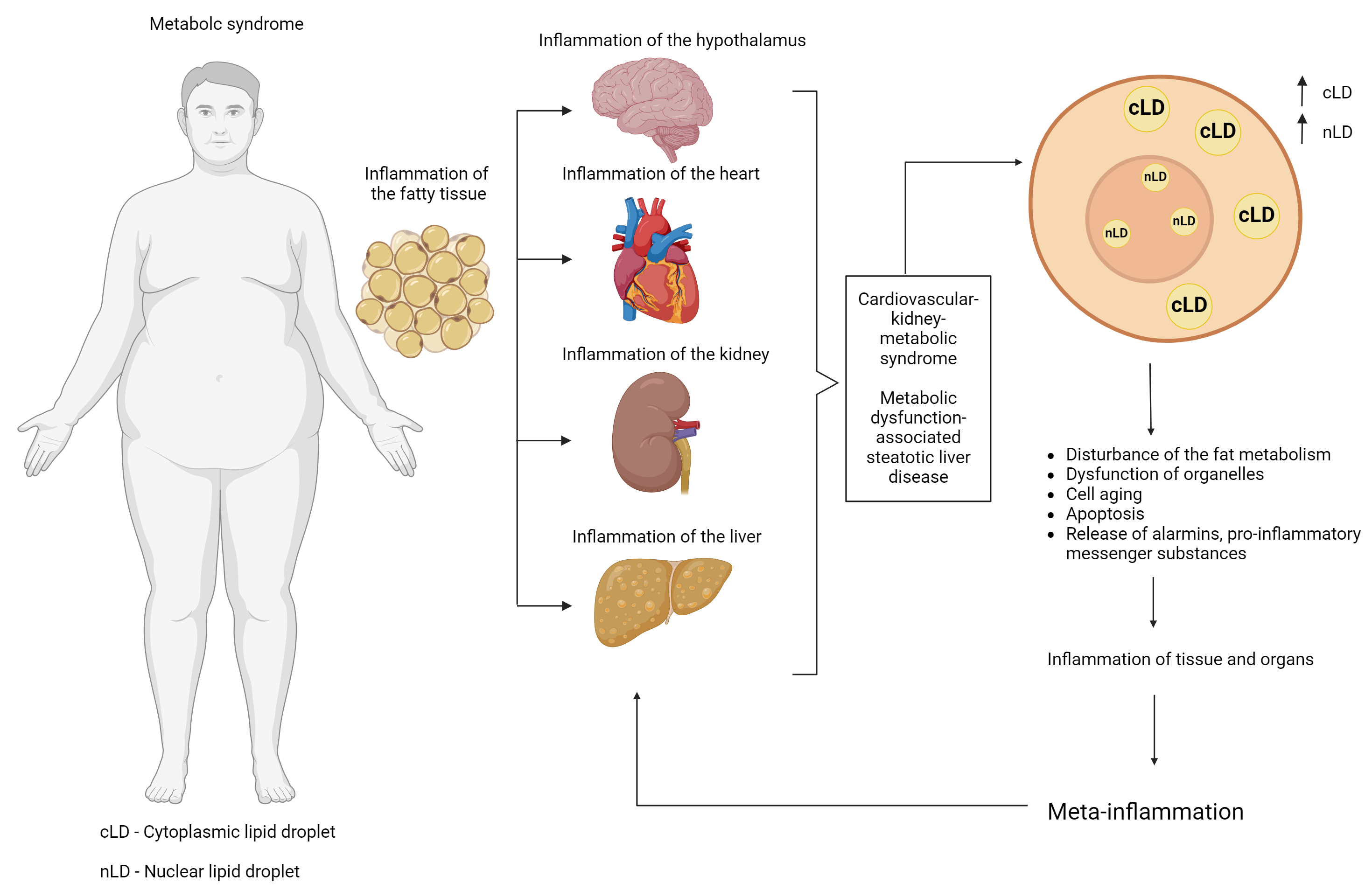 Fig. 1. Possible linking role of lipid droplets in the progression of metabolic syndrome (and its components) and the development of pathological metainflammation. Created with Biorender.com.
