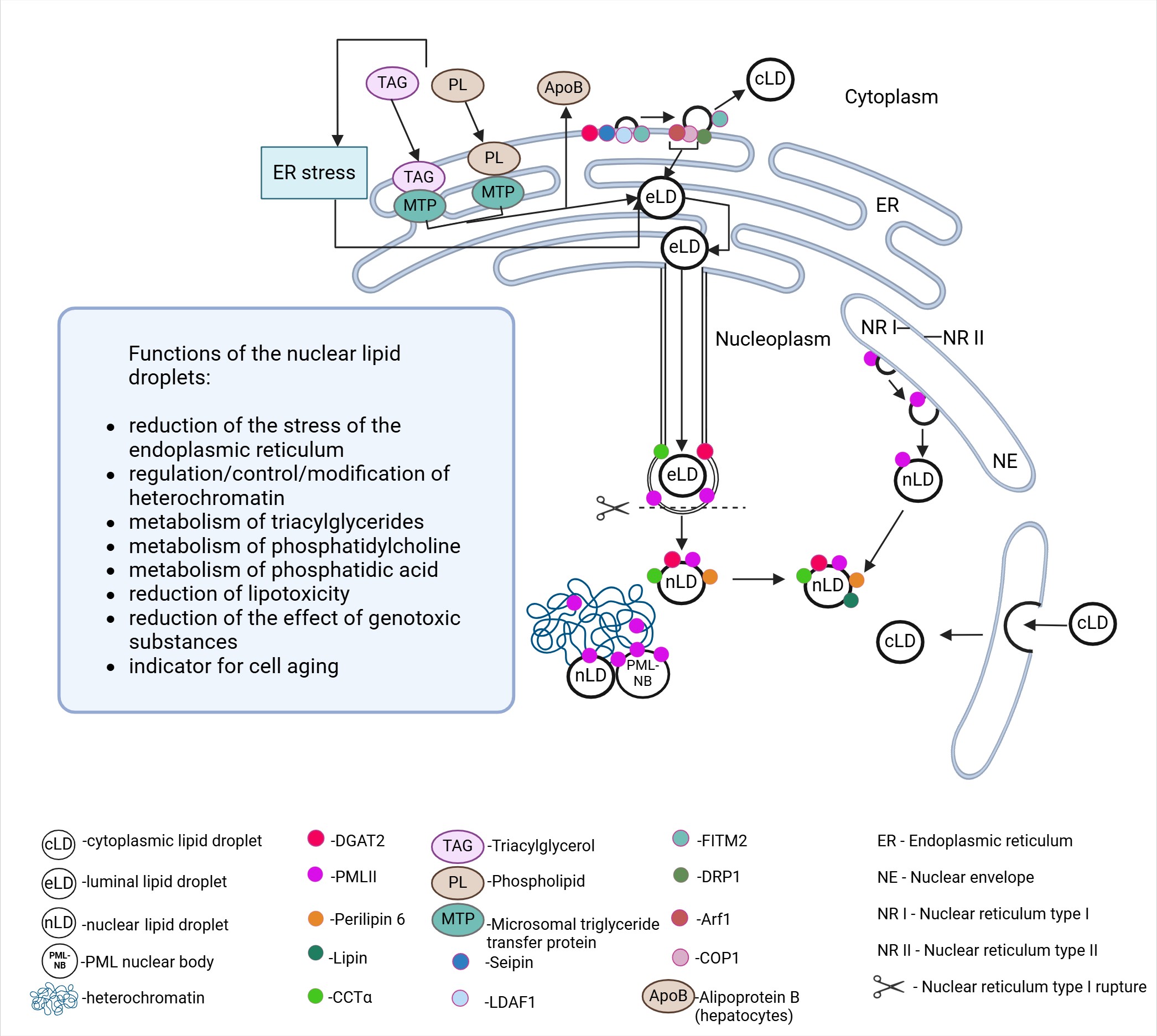 nLDs in hepatocytes are associated with PML NB, which is involved in the regulation of gene transcription [37]. In contrast to perilipin-2 (PLIN2), in mammals, PLIN5 is located in the nucleus and functions as part of a transcriptional regulatory complex that controls mitochondrial gene programs [84]. Although no association of PLIN5 with nLDs is known [50], nLDs have been identified with dyes specific for perilipin-3 (PLIN3) and Rab18 [37]. LDL synthesis in hepatocytes has been found to involve MTP, which is localized in the ER. MTP assists in the transfer of ceramides and sphingomyelin to apoB-containing lipoproteins and participates in the biosynthesis of cholesterol ester and cluster of differentiation 1d (CD1d) [85]. MTP induces the formation of apoB-containing primary particles and ApoB-deficient eLDs in the ER, leading to the production of mature LDL [85, 86, 87]. ER stress increases MTP activity [88], induces the accumulation of apoB-deficient LDs, and generates more nLDs, which serve as LDL precursors in the ER lumen. eLDs growing in type I NRs are translocated to the nucleoplasm as the NR membrane ruptures in the presence of localized lamin deficiency and the membrane becomes mechanically unstable. It is assumed that MTP-dependent lipid transfer into eLDs leads to their growth and the destruction of the type-I NR membrane. In addition, the lack of lamins could be related to the presence of the PML-II protein [37, 89].