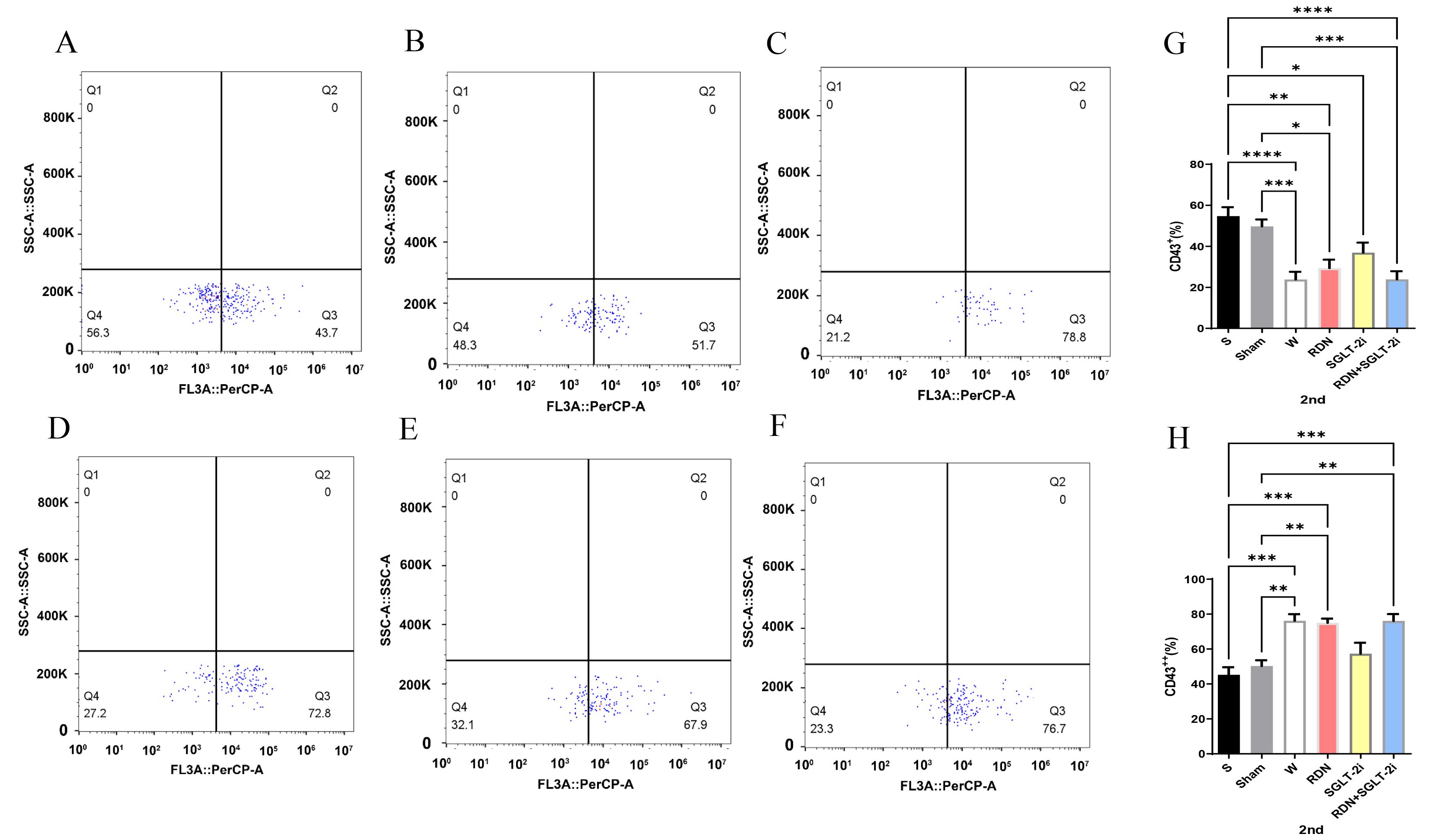 group; (E) SGLT-2i group; (F) SGLT-2i+RDN group. (G–H) Proportion of flow cytometry