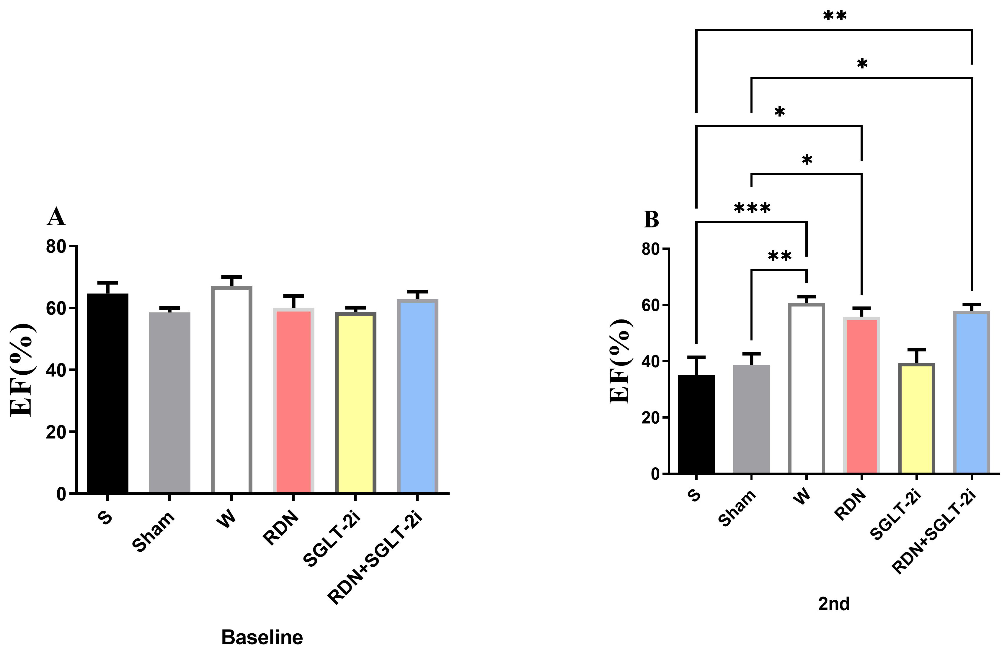 Baseline EF; (B) EF at the endpoint. One-way analysis of variance, *p