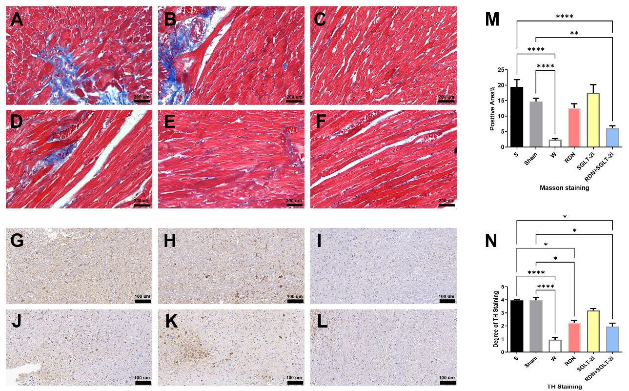 C-Fos expression in the RDN group was considerably increased, indicating a notable improvement in overexcitation of the sympathetic nervous system after RDN treatment. Furthermore, the high C-Fos expression in the RDN+SGLT-2i group confirmed our initial hypothesis that combining these two therapies was feasible. Combining the cardiac function indicators, we found that the pathological results were consistent with those of the cardiac function indicators in the RDN+SGLT-2i group. Pathology revealed a smaller cross-sectional area of myocardial cells via WGA fluorescence staining, increased C-Fos fluorescence intensity, and a lower percentage of myocardial fibrosis in the RDN+SGLT-2i group than in the control group, indicating that cardiac function was protected by the combined treatment of RDN and DAPA. The EF of the RDN+SGLT-2i group rats was similar to the W group. Additionally, the difference between the RDN+SGLT-2i and S groups was more significant based on the comparison of TH staining, which was better than that of the RDN group. This decrease in inflammatory factor levels is consistent with the pathology and ultrasound results.