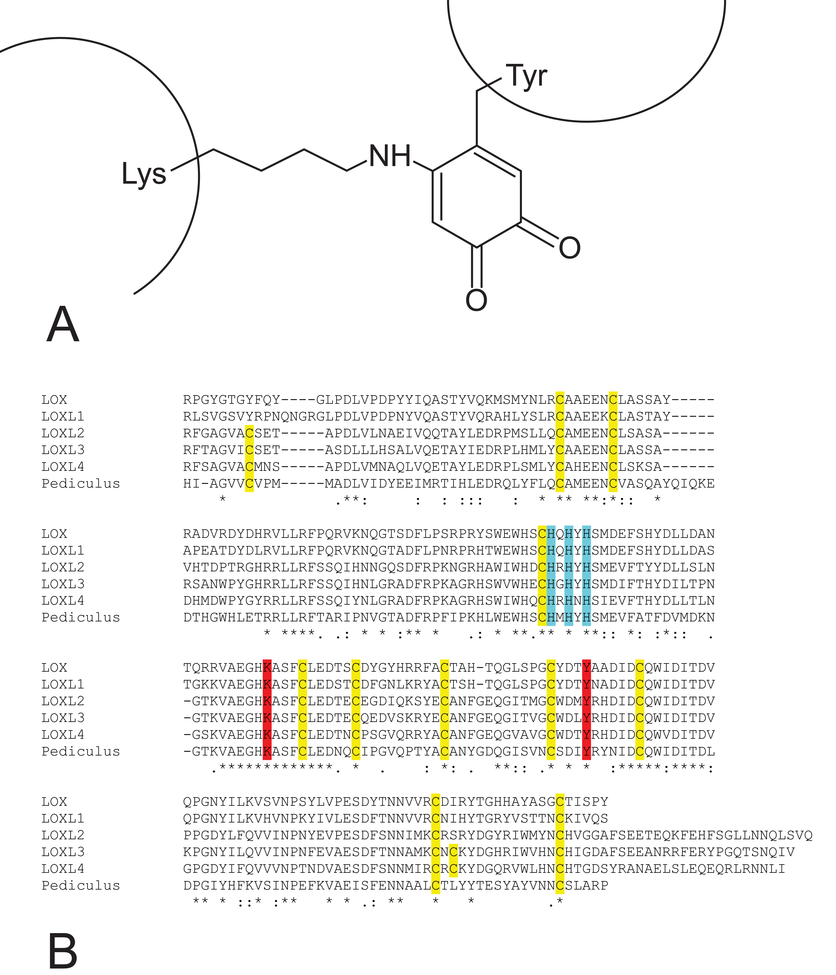 Fig. 1. Lysine tyrosylquinone (LTQ) cofactor in lysyl oxidases. (A) structure of LTQ; (B) amino acid sequence context for LTQ formation. Multiple alignment of the high homology region of catalytic domains of human lysyl oxidase isoforms with pediculus as an outgroup. Turquoise—histidine residues of the copper binding site; yellow—cysteine residues; red—lysine and tyrosine residues that form the LTQ cofactor.
