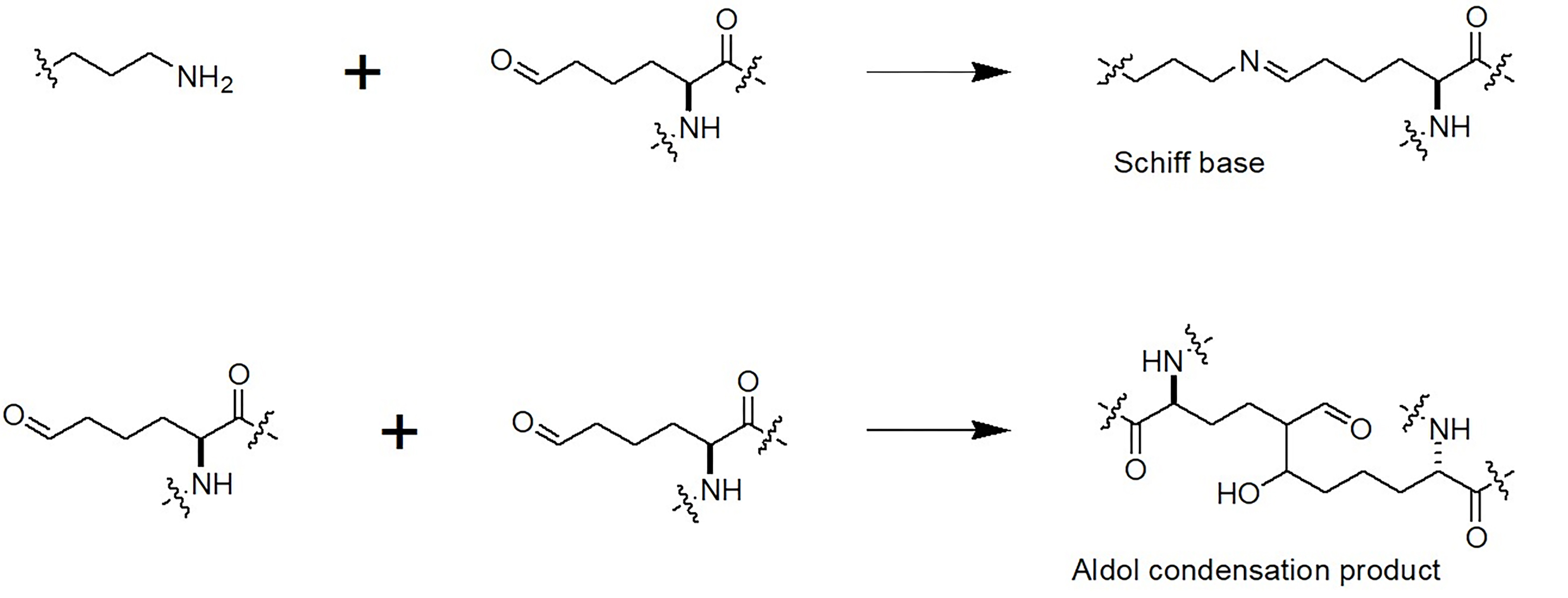 The allysines then spontaneously react with other lysine or hydroxylysine residues to form covalent bonds and thus cross-linked polypeptide products: peptidyl-