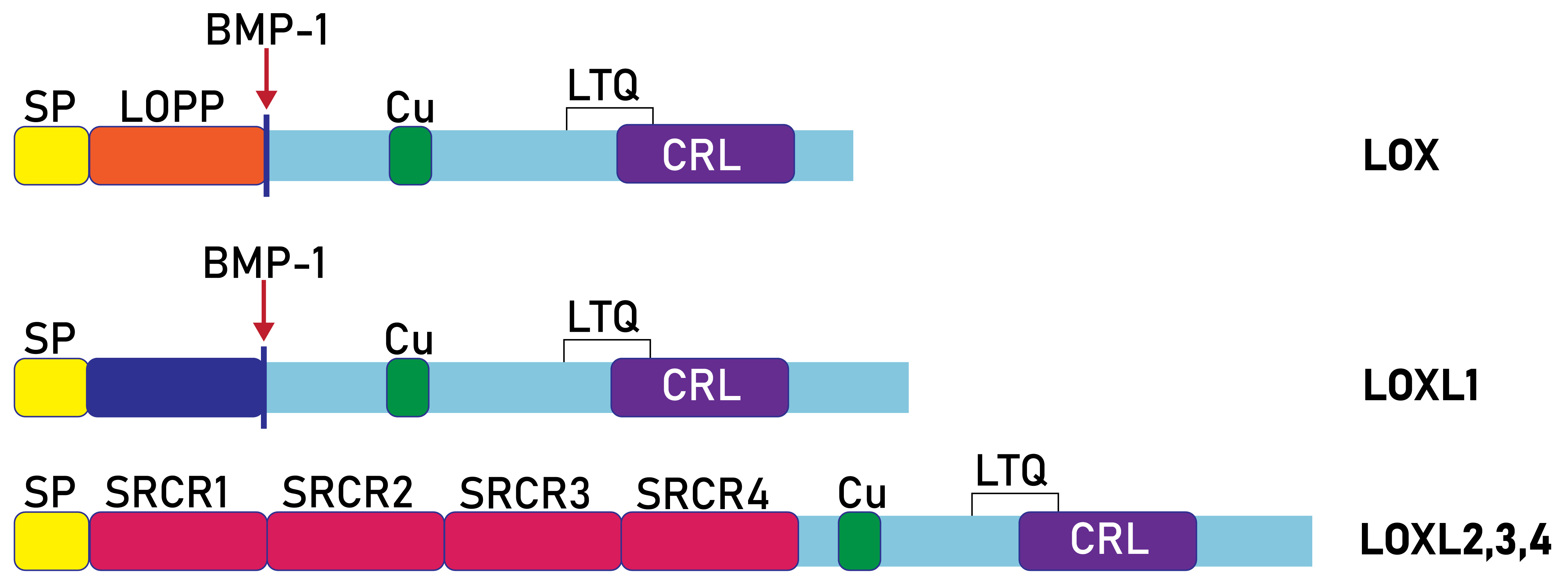 Fig. 3. Domain composition of human lysyl oxidases. SP, signal peptide; SRCR, scavenger receptor cysteine-rich; Cu, Cu2+ binding site; LOX, lysyl oxidase; LOPP, lysyl oxidase propeptide; CRL, cytokine-receptor like; LOX and LOXL1 are proteolytically processed by bone morphogenetic protein 1 (BMP-1).