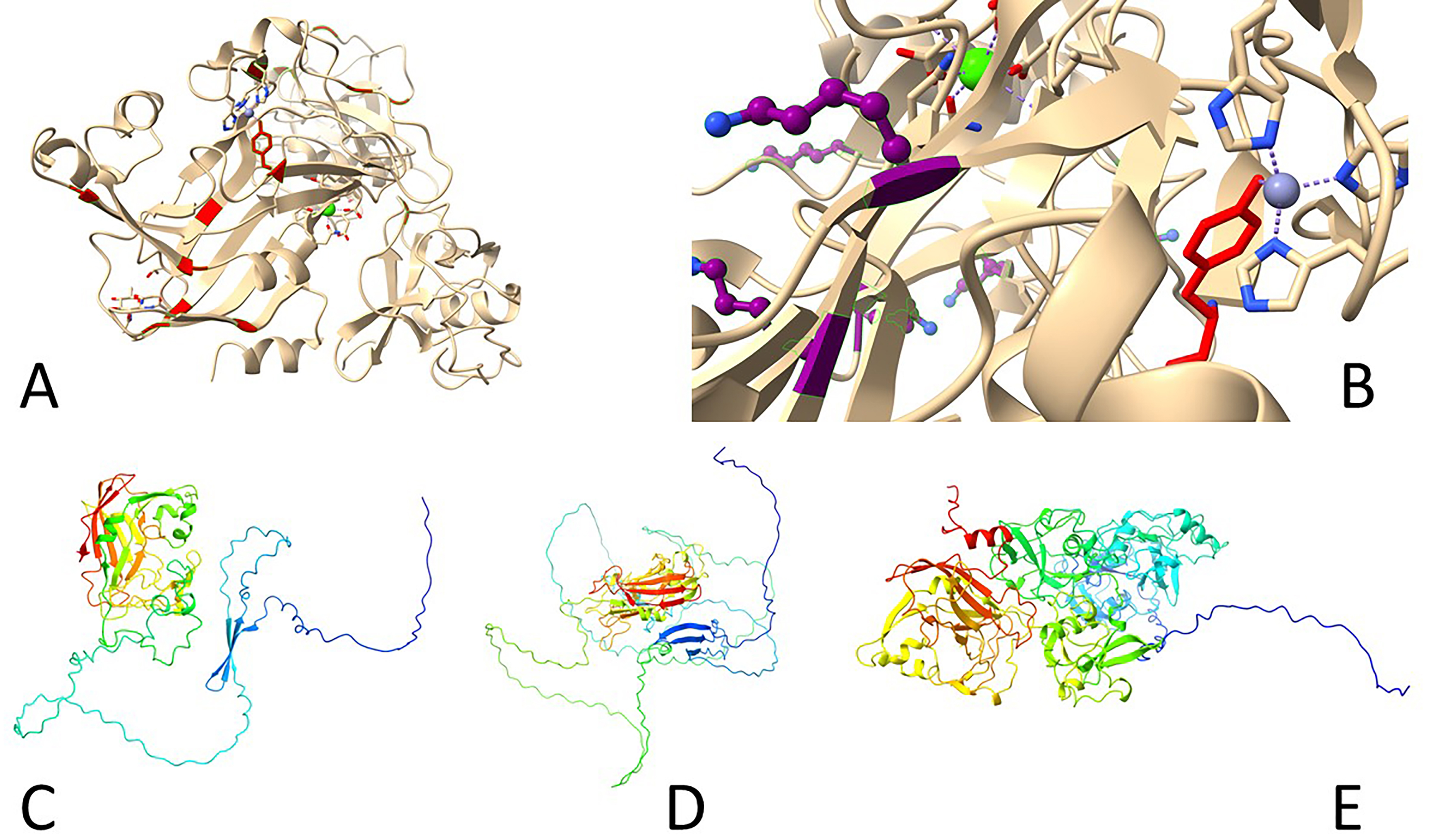 Fig. 6. Three-dimensional structures of human lysyl oxidases. (A,B) Reported inactive Zn-bound precursor of human LOXL2 (5ze3). (A) Tyrosine residues shown in red, including Y689 side chain. (B) Lysine residues shown in purple, note K653 turned away from Y689, which interacts with a Zn atom coordinated by three histidine residues (H626, H628, H630). (C–E) Predicted structures by AlphaFold 2 ((C) LOX, (D) LOXL1, (E) LOXL2). Note long N-terminal disordered portions.