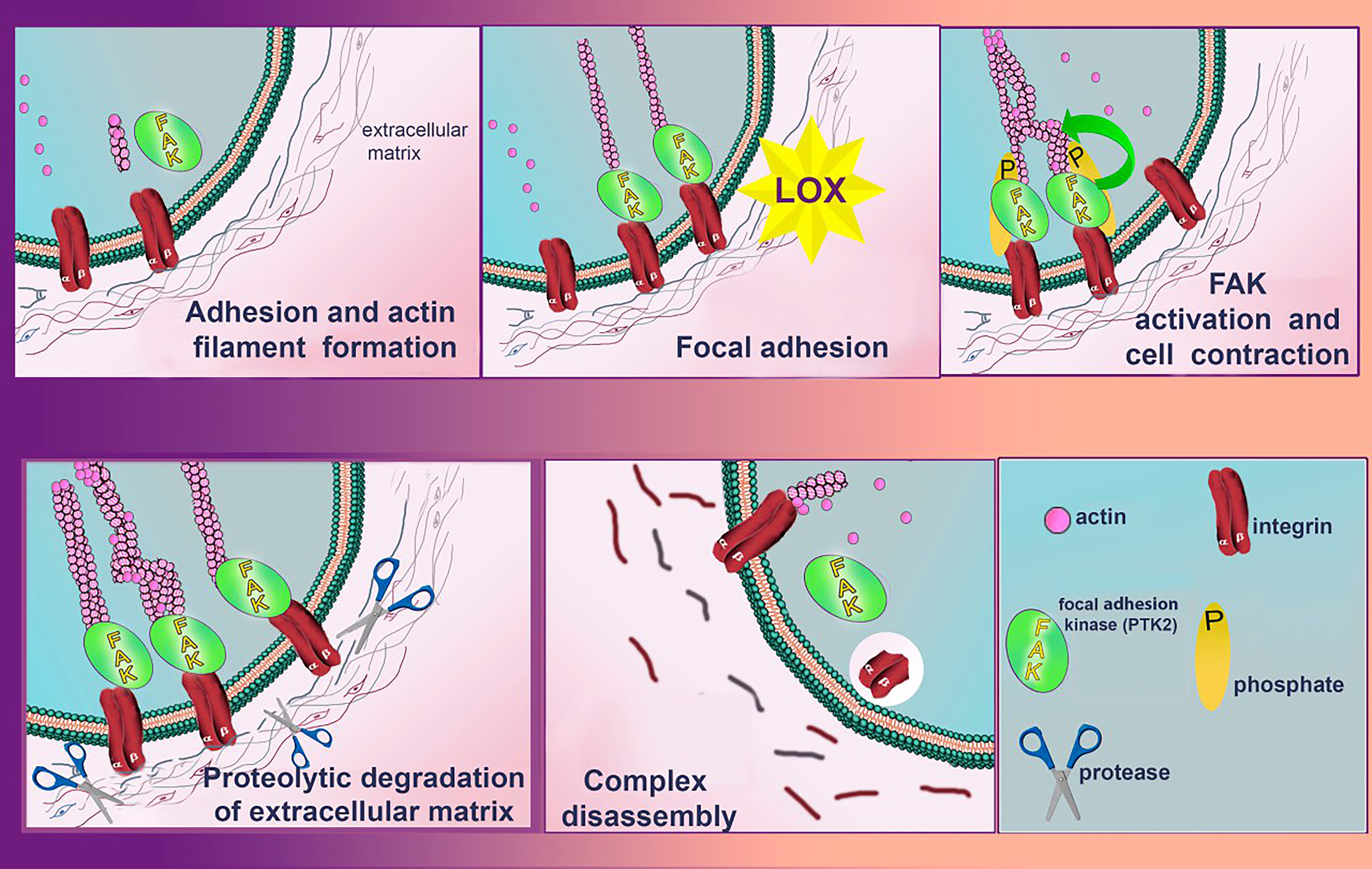 Fig. 7. Role of LOXs in controlling cell migration activity via focal adhesion kinase (FAK)/Src signaling pathway. LOXs enzymatic activity increases the stiffness of the extracellular matrix (ECM), which leads to clustering of integrins. The clustered integrins affect FAK phosphorylation and trigger a subsequent signaling cascade that eventually leads to the formation of lamellopodium and phyllopodium actin fibers and stimulates cell migration. In parallel, the LOXs-catalyzed oxidation reaction releases hydrogen peroxide, also stimulating the activation of the FAK/Src signaling pathway. During proteolytic degradation of the ECM, FAK signaling complex and actin filaments of filopodia and lamellopodia dissociate. Created with Adobe Photoshop.