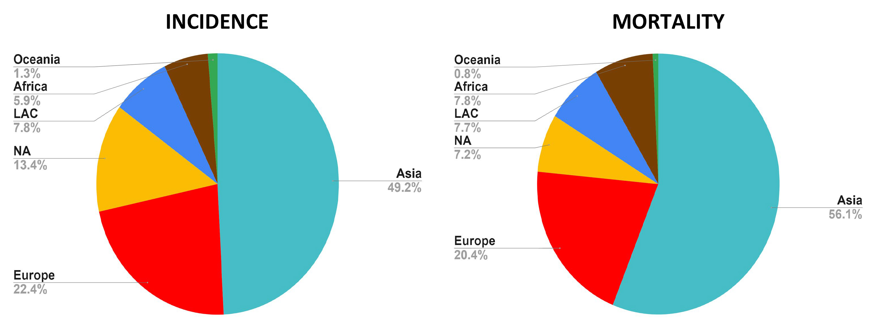 Fig. 1. Incidence and mortality rates of cancer in all continents. The Asian continent contributes with the highest percentage of incidence and mortality rates, whereas Oceania displays the lowest frequencies. Asia and Africa are the continents with a proportionally increased mortality rate compared to their respective incidence frequency. These data reflect both men and women (Global Cancer Observatory, accessed November 30, 2024). LAC, Latin America and the Caribbean; NA, North America (created with Microsoft Excel).