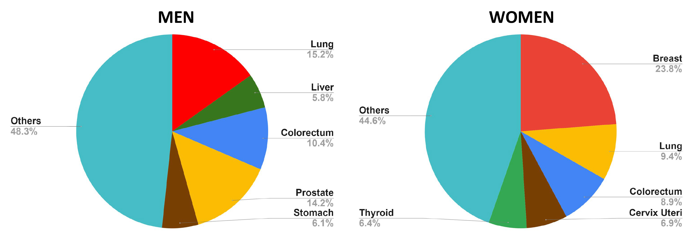 Fig. 2. Top 5 most frequent cancers in men and women, highlighting the prevalence of each type within the respective populations. In men, the most commonly diagnosed cancers include lung, prostate, colorectal, stomach, and liver. For women, the top five cancers are breast, lung, colorectal, uterine, and thyroid cancer. The data underscores the variations in cancer incidence between genders, reflecting differences in risk factors, screening practices, and biological susceptibility (Global Cancer Observatory, accessed October 25, 2024) (created with Microsoft Excel).