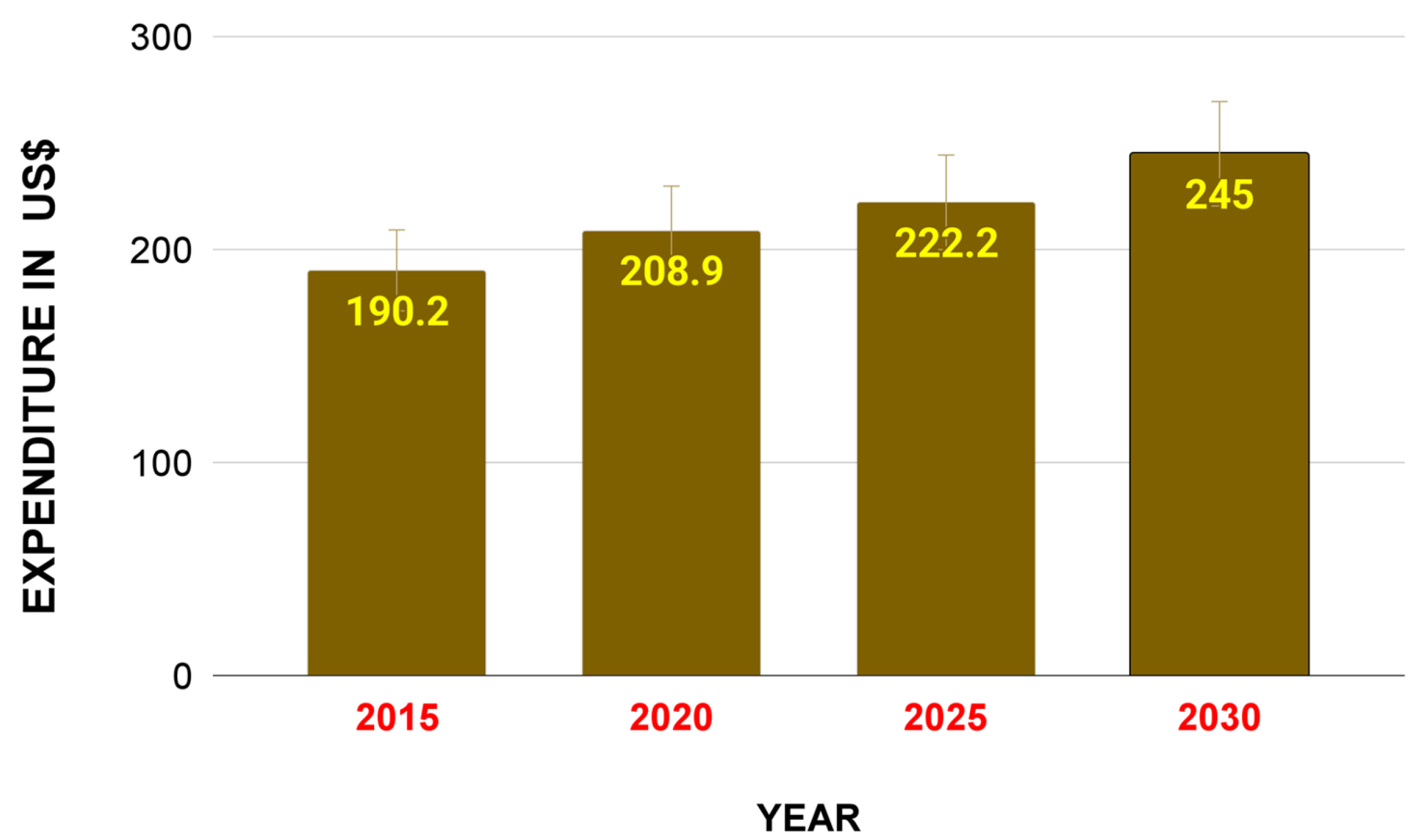 Fig. 3. Impact of cancer burden on the US economy. This graph illustrates national cancer expenditures in the United States of America in 2015 and 2020 and forecasts through 2030. A substantial increase in US cancer spending has a major impact on the economy, with this cost of cancer care being associated with the growth and aging of the population (obtained from the cancer trends progress report https://progressreport.cancer.gov/, created with Microsoft Excel).