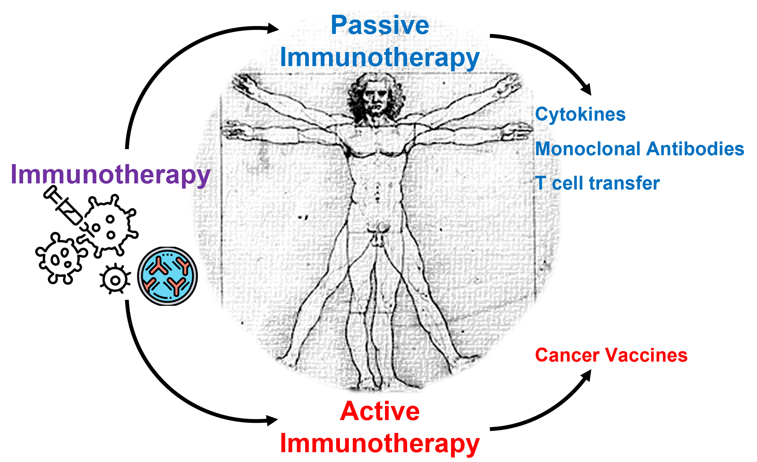 Fig. 4. Different types of cancer immunotherapies. Active and passive immunotherapies are two different approaches used to stimulate or enhance the patient’s immune responses. Active immunotherapy involves stimulating the body’s immune system to generate a protective response against a specific target, whereas passive immunotherapy involves administering antibodies, cytokines, or immune components directly to a patient to provide immediate but temporary protection (created by GPAM, using Microsoft PowerPoint software).