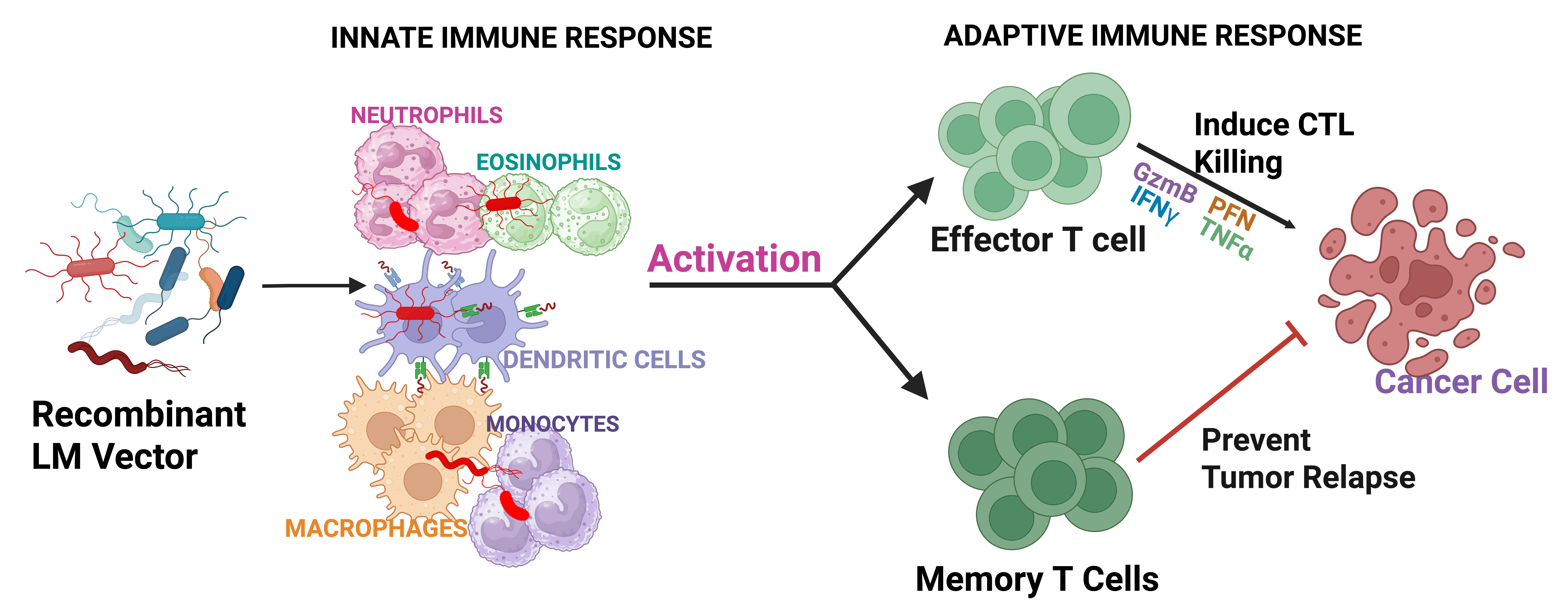 The process of induction of memory T cells by LM is a pivotal aspect of its role as an effective model for cancer vaccines. Following the initiation of innate immune responses, LM’s ability to replicate within host cells allows it to deliver tumor-associated antigens to dendritic cells, which are essential for the activation and differentiation of naïve T cells. This process begins with the cross-presentation of antigens, where dendritic cells process intracellular antigens from LM and present them on major histocompatibility complex (MHC) class I molecules to CD8+ T cells [42]. As CD8+ T cells are primed, they undergo clonal expansion and differentiation into cytotoxic T lymphocytes (CTLs), which actively seek out and eliminate tumor cells exhibiting the same antigen [54, 56, 74, 75]. Moreover, CD4+ T helper cells are also activated, assisting in the overall T cell response and enhancing the cytotoxic capabilities of CD8+ T cells through the release of supportive cytokines such as interferon-gamma (IFN-
