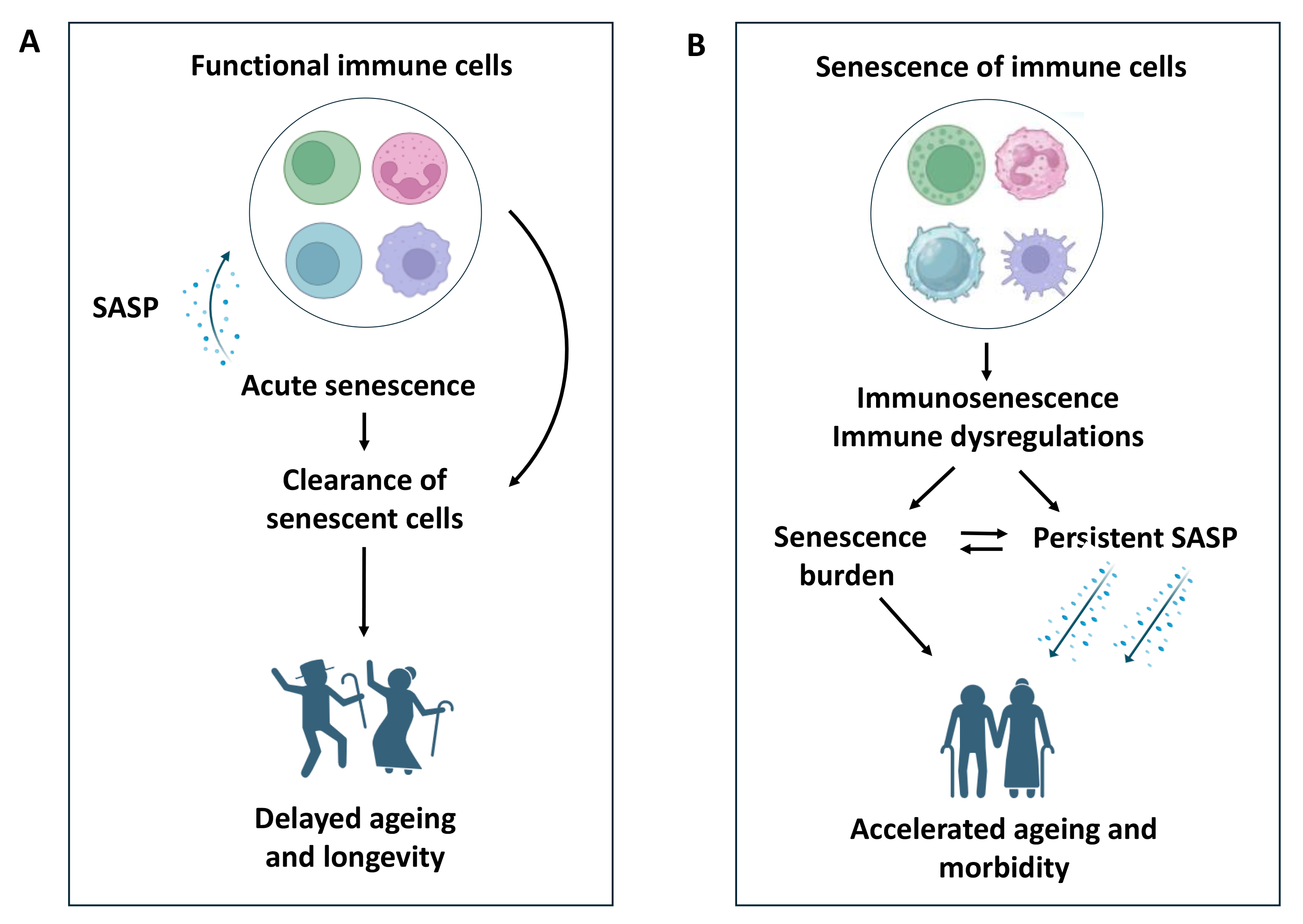 Fig. 1. The impact of immunity on senescence and ageing. (A) Functional immune cells drive the clearance of senescent cells via senescence-associated secretory phenotype (SASP)-mediated recruitment and thereby prevent both senescence burden and persistent SASP, leading to acute senescence. Thus, functional immune cells favour delayed ageing and longevity by minimising any detrimental impact of sustained senescence on ageing. (B) Senescence of immune cells that leads to immunosenescence and immune dysregulations fails to clear senescent cells, and thereby leads to both senescence burden and persistent SASP. Hence, immunosenescence accelerates the ageing process and associated morbidity.