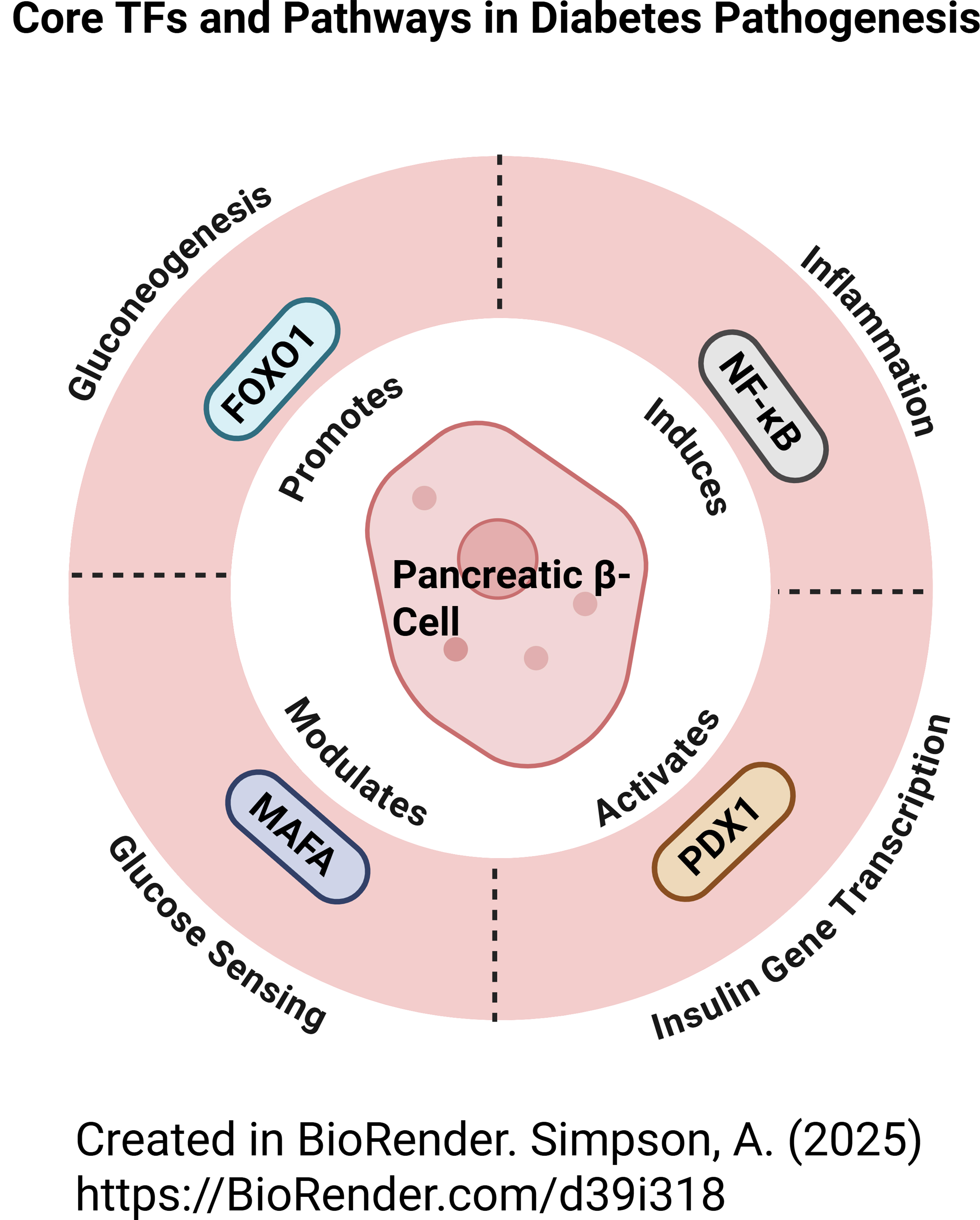 TFs play important roles in diabetes management by regulating metabolic pathways that influence metabolic processes, such as lipid metabolism and insulin sensitivity. For instance, forkhead box protein O1 (FOXO1) is a major transcription factor that controls hepatic gluconeogenesis; inhibition of this factor reduces glucose overproduction and increases sensitivity to insulin. In contrast, sterol regulatory element-binding protein 1c (SREBP1c) controls lipogenesis in the liver and its overactivity contributes to hepatic steatosis and hyperlipidaemia. Thus, the specific targeting of these factors by selective inhibitors or modulators may offer alternative valid therapeutic approaches to metabolic dysfunction with fewer side effects. The complex mechanisms developed in relation to these TFs interact with signalling pathways such as PI3K/protein kinase B (Akt) and AMP-activated protein kinase (AMPK). A deeper understanding of these factors will lead to the development of safer and more effective therapies against diabetes [1].