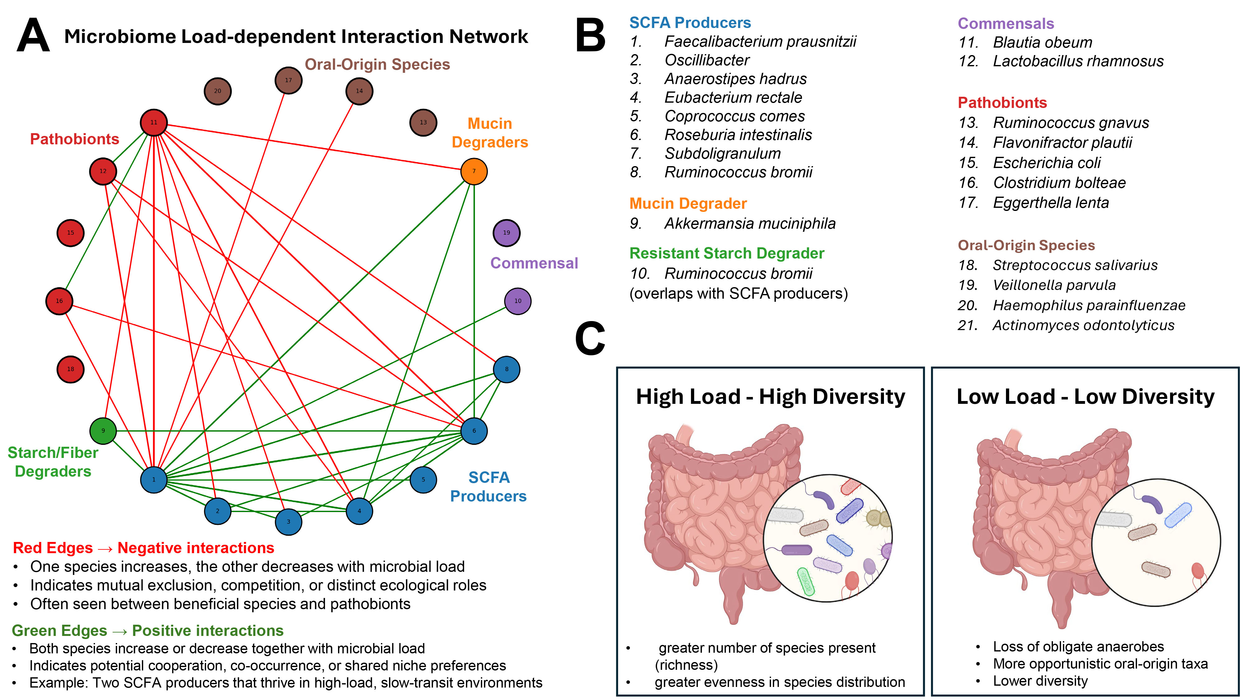 Fig. 1. Microbial load-dependent structure of the gut microbiome. (A) Interaction network of 20 selected gut microbial species derived from their correlation patterns with microbial load across human cohorts (species selection was based on the top 20% highest values of correlations, data taken from Fig. 1C in [1]). Nodes are color-coded by functional group (e.g., short-chain fatty acid [SCFA] producers, pathobionts, oral-origin species), and edges represent interaction types: green = positive correlations (co-occurring responses to microbial load), red = negative correlations (inverse responses). (B) Functional grouping of species included in the network, highlighting ecological roles such as SCFA production, mucin degradation, and oral-origin transients. (C) Conceptual model illustrating the relationship between microbial load and community diversity: high-load environments support diverse, anaerobic, health-associated microbiota, while low-load environments are characterized by reduced diversity, loss of obligate anaerobes, and increased prevalence of oral-origin or stress-tolerant taxa. Created with BioRender.com.