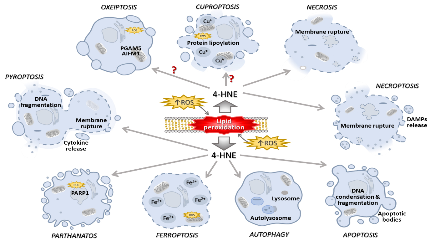 Various mechanisms and phenotypes of regulated cell death are now known, while apoptosis was the first type of regulated cell death discovered. 4-HNE has been shown to play a role in apoptosis as well as in other forms of regulated cell death. The following is, therefore, an overview of the known mechanisms and involvement of 4-HNE in apoptosis, ferroptosis, autophagy, pyroptosis, necroptosis, parthanatos, oxeiptosis, and cuproptosis.