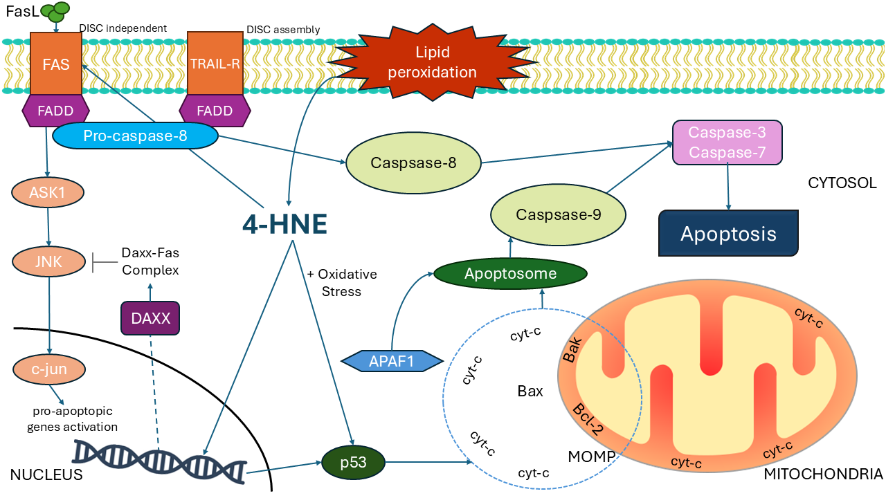 Fig. 2. The involvement of 4-HNE in apoptosis. 4-HNE, a by-product of lipid peroxidation, induces apoptosis by activating FAS and the TRAIL pathways. The ASK1/JNK pathway triggers AP-1-dependent transcription through the DISC-independent route. After JNK phosphorylation, the c-jun transcription factor translocates to the nucleus and regulates the expression of pro-apoptotic genes. Exported Daxx is involved in the regulation of the FAS pathway. The intrinsic apoptotic pathway is induced by oxidative stress, p53, and mitochondrial membrane disturbances. The figures are drawn in PowerPoint (Microsoft Office 2019, Redmond, WA, USA) and Inkscape (Software Freedom Conservancy, Brooklyn, NY, USA). Abbreviations: 4-HNE, 4-hydroxynonenal; AP-1, activator protein 1; ASK1, apoptosis signal-regulating kinase 1; Daxx, death domain-associated protein; FADD, Fas-associated protein with death domain; FasL, Fas ligand; JNK, c-Jun N-terminal kinase; cyt-c, cytochrome c; MOMP, mitochondrial outer membrane permeabilization; TRAIL, TNF-related apoptosis-inducing ligand; Bak, Bcl-2 homologous antagonist/killer; Bax, Bcl-2-associated X protein; Bcl-2, B-cell lymphoma 2.
