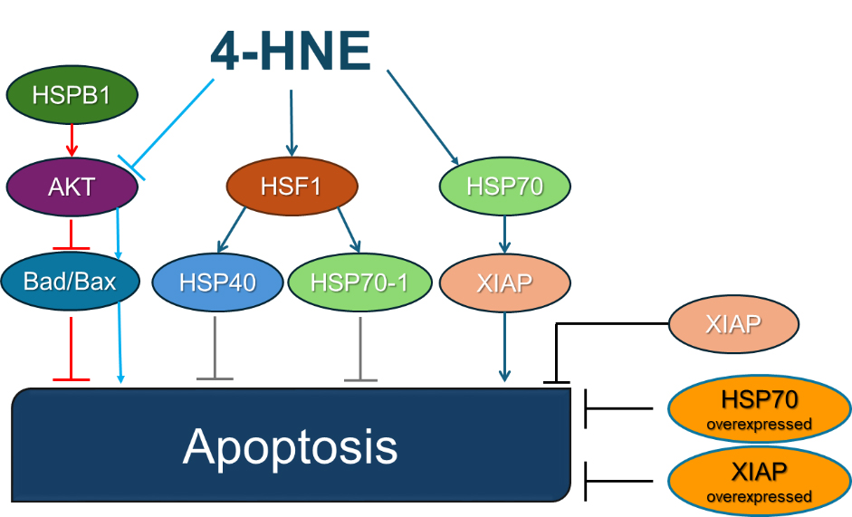 Fig. 3. Heat shock proteins and 4-HNE in apoptosis. 4-HNE modifies HSP70 without altering its overall expression levels. Modified HSP70 downregulates the apoptosis-inhibitory protein XIAP, thereby indirectly enhancing apoptosis. Experimental overexpression of either HSP70 or XIAP effectively counteracts 4-HNE-induced apoptosis by providing stronger apoptotic inhibition. 4-HNE activates HSF1, leading to elevated expression of HSP40 and HSP70-1, which enhances the cellular stress response, providing protective, anti-apoptotic effects. HSPB1 stimulates Akt kinase, which inhibits pro-apoptotic proteins Bad and Bax, thereby preventing apoptosis under normal conditions. 4-HNE-mediated inhibition of Akt kinase removes this protective inhibition, indirectly activating Bad/Bax and promoting apoptosis. The figures are drawn in PowerPoint (Microsoft Office 2019, Redmond, WA, USA). Abbreviations: 4-HNE, 4-hydroxynonenal; HSP, heat shock protein; XIAP, X-linked inhibitor of apoptosis protein; HSF1, heat shock factor 1; Akt, protein kinase B; Bad, Bcl-2-associated death promoter; Bax, Bcl-2-associated X protein.