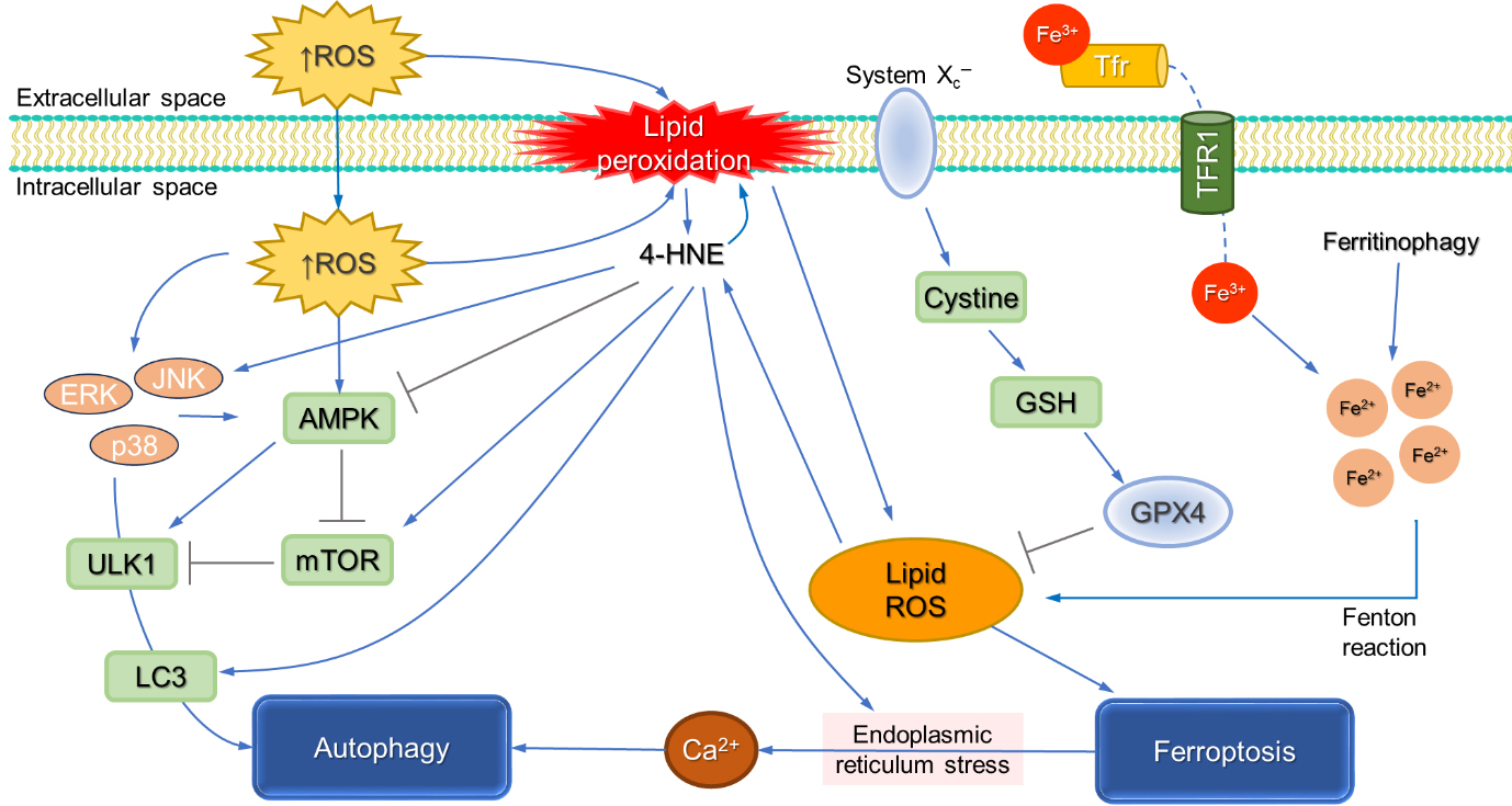 Fig. 4. The involvement of 4-HNE in ferroptosis and autophagy. Excessive ROS promotes peroxidation of membrane-bound PUFAs, triggering a chain reaction of lipid peroxidation and formation of lipid ROS and eventually 4-HNE. GPX4 has a major role in lipid ROS detoxification. Inhibition of the cystine/glutamate antiporter Xc– system deprives cellular cysteine, affecting GSH biosynthesis that consequentially impacts GPX4 activity, resulting in elevated lipid ROS. Intracellular labile iron accumulation further promotes the accumulation of lipid ROS, eventually resulting in ferroptotic cell death. Alternatively, 4-HNE can inhibit autophagy by inhibiting AMPK activity but also promote autophagy via a modified JNK pathway. Moreover, 4-HNE was shown to activate the mammalian target of rapamycin (mTOR) pathway to trigger light chain 3 (LC3) formation and induce endoplasmic reticulum stress, all of which promote autophagy. The figures are drawn in PowerPoint (Microsoft Office 2019, Redmond, WA, USA). Abbreviations: 4-HNE, 4-hydroxynonenal; AMPK, AMP-activated protein kinase; GSH, glutathione; GPX4, glutathione peroxidase 4; JNK, c-Jun N-terminal kinase; Xc–, the cystine/glutamate antiporter system.