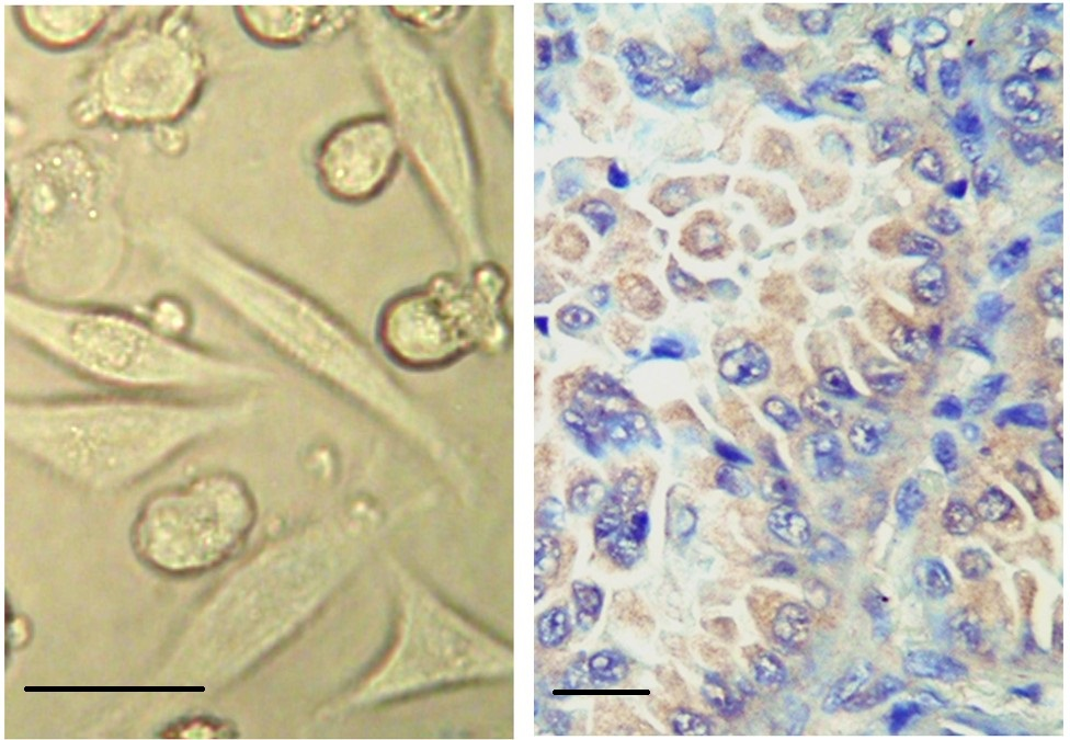 Fig. 5. Necrosis induced by 4-HNE. 4-HNE added at 100 µM to human carcinoma cells (HeLa; ATCC, Manassas, VA, USA) in vitro induces necrosis in some cells in less than five minutes, which is associated with the shrinking of the cells into a rounded, pyknotic shape associated with lipid peroxidation of the cellular membrane manifested by blebbing (left photo, no staining, magnification 650