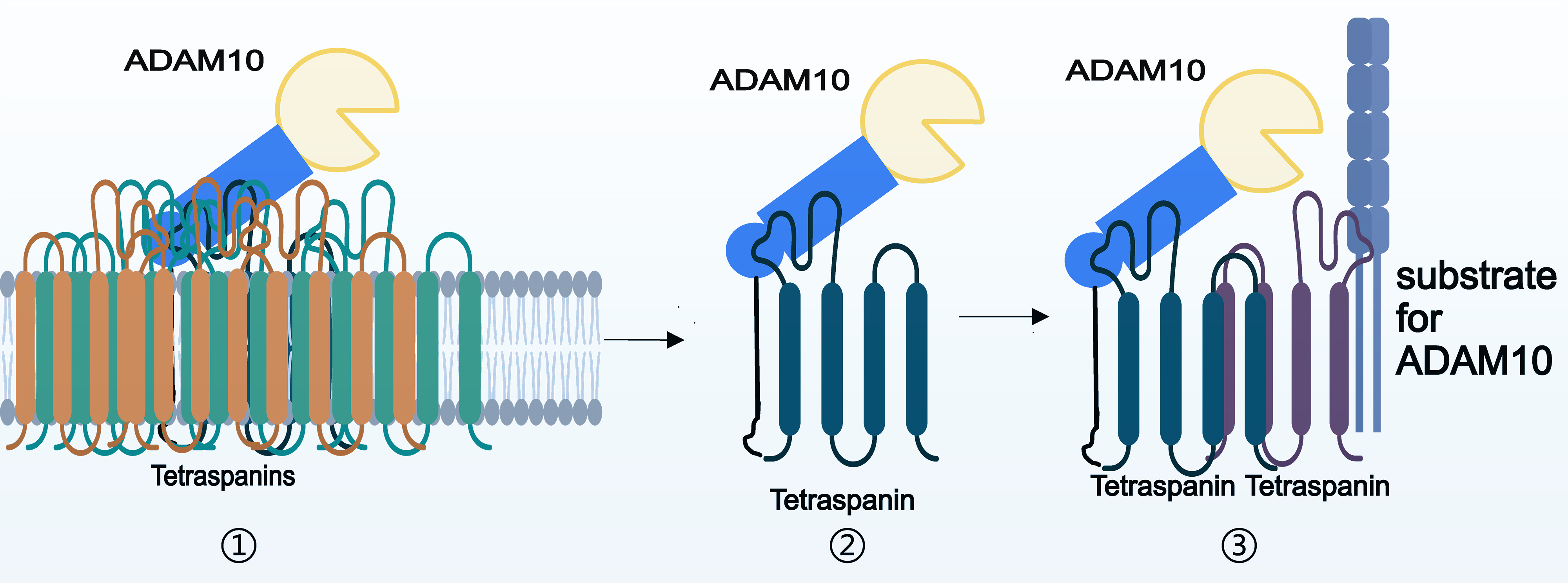 Fig. 2. Basis of the interaction between ADAM10 and tetraspanins. ① Multiple tetraspanins incorporate ADAM10 into tetraspanin-enriched domains by interacting with each other. ② Tetraspanins interact directly with ADAM10 by binding to it through a large extracellular loop. ③ Tetraspanins indirectly interacts with ADAM10 by interacting with other tetraspanins.