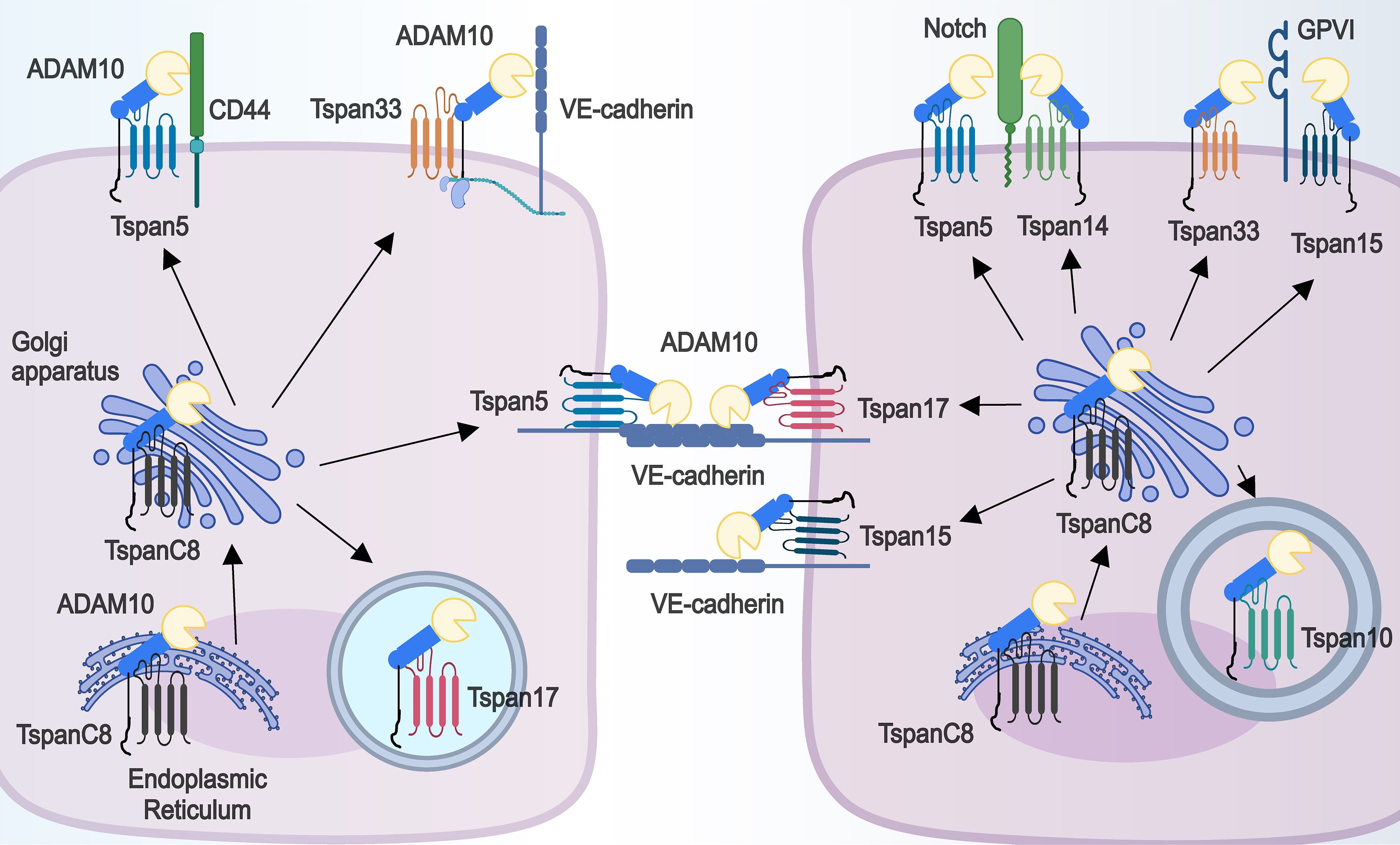 Fig. 3. TspanC8 subfamily members can directly affect the subcellular localization and substrate selectivity of ADAM10. Each TspanC8 member binds directly to ADAM10, assists in the transport of ADAM10 out of the ER, and facilitates the distribution of ADAM10 either intracellularly (Tspan10 and Tspan17) or at the cell membrane (Tspan5, Tspan14, Tspan17, Tspan15, and Tspan33). At the plasma membrane, Tspan5, Tspan14, Tspan15 and Tspan33 bind to the tetraspanin web in different ways and affect ADAM10 cleavage of various substrates (e.g., CD44, VE-cadherin, Notch, Glycoprotein VI (GPVI)).