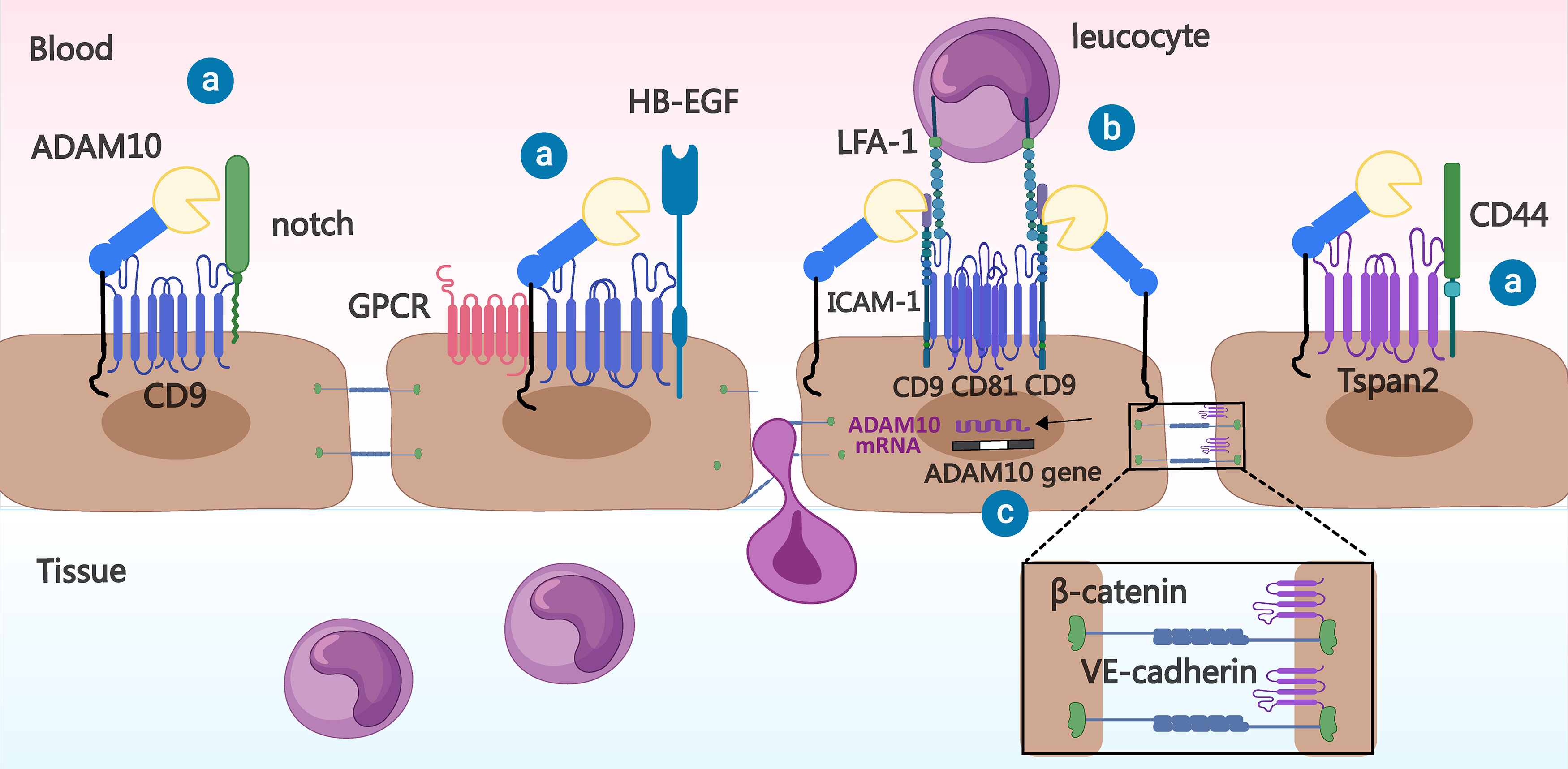 Fig. 4. Relationship between Tspan8 subfamily members and ADAM10 in inflammation. ⓐ Tspan8 family members bind to ADAM10 and may help it process substrates (e.g., Notch, Heparin Binding EGF Like Growth Factor (HB-EGF), and CD44). ⓑ CD9 and CD81 on the vascular endothelial cell membrane can promote leukocyte adhesion to the vascular endothelial cell surface by recruiting cell adhesion molecules, such as Intercellular cell adhesion molecule-1 (ICAM-1), whereas ADAM10 has a hydrolytic effect on the extracellular domain of ICAM-1. ⓒ Tspan2 prevents