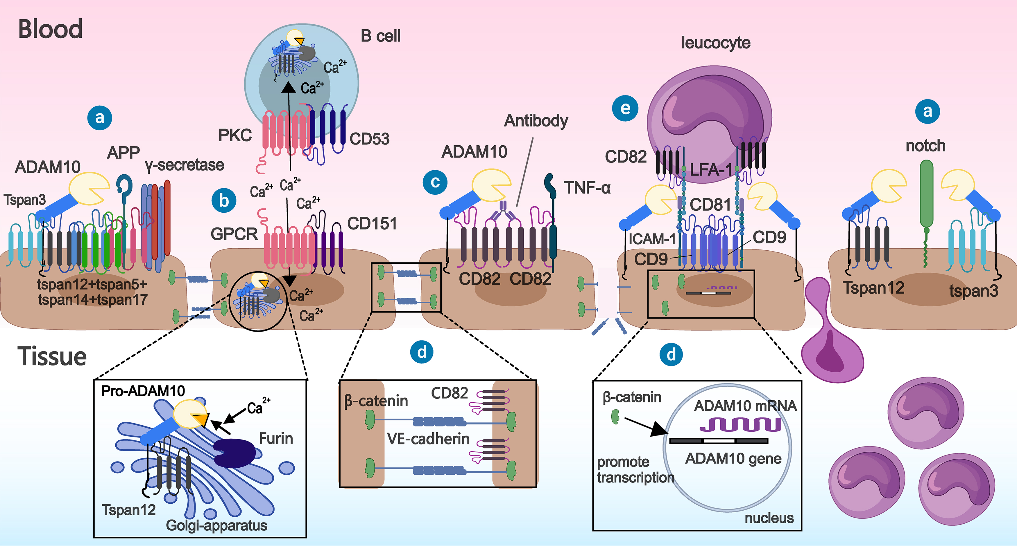 Several studies have found that specific members of the tetraspanin family regulate the activities of various ADAM proteins, particularly ADAM10. These studies also revealed that a large proportion of ADAM10 molecules on the cell membrane interact with tetraspanins [15, 16]. Tetraspanins are a family of ubiquitously expressed and evolutionarily conserved proteins in multicellular organisms, and there are 33 identified members [17, 18] with different distributions in different cells and tissues [19, 20, 21]. On the basis of their amino acid sequences, these members can be classified into different subfamilies, such as the TspanC8 subfamily and the Tspan8 subfamily [22, 23, 24, 25]. By interacting with other tetraspanins and a variety of interacting partners, facilitated by gangliosides, palmitoylation, and cholesterol, tetraspanins form wide-ranging complexes of fewer than 10 transmembrane proteins ranging in size from 100 to 200 nm known as the tetraspanin web [17, 26, 27]. These tetraspanin webs facilitate the lateral assembly of integrins, immunoreceptors, and signaling effectors into functional clusters, thereby modulating critical vascular processes, including leukocyte adhesion, paracellular permeability, and angiogenic signaling cascades. The spatial organization within the tetraspanin web enables bidirectional regulation of signal transduction—enhancing agonist sensitivity through co-receptor recruitment while simultaneously constraining excessive activation via intramembrane compartmentalization. This sophisticated architecture underpins endothelial barrier homeostasis and inflammatory responses, positioning tetraspanins as pivotal coordinators of vascular pathophysiology [19]. Cellular exosomes containing tetraspanins such as CD63 and CD81 can deliver their contents (e.g., microRNAs (miRNAs)) to specific target cells and participate in intercellular communication [28]. This enables them to assume diverse roles in response to various pathogenic infections, such as bacteria and viruses [21, 28].