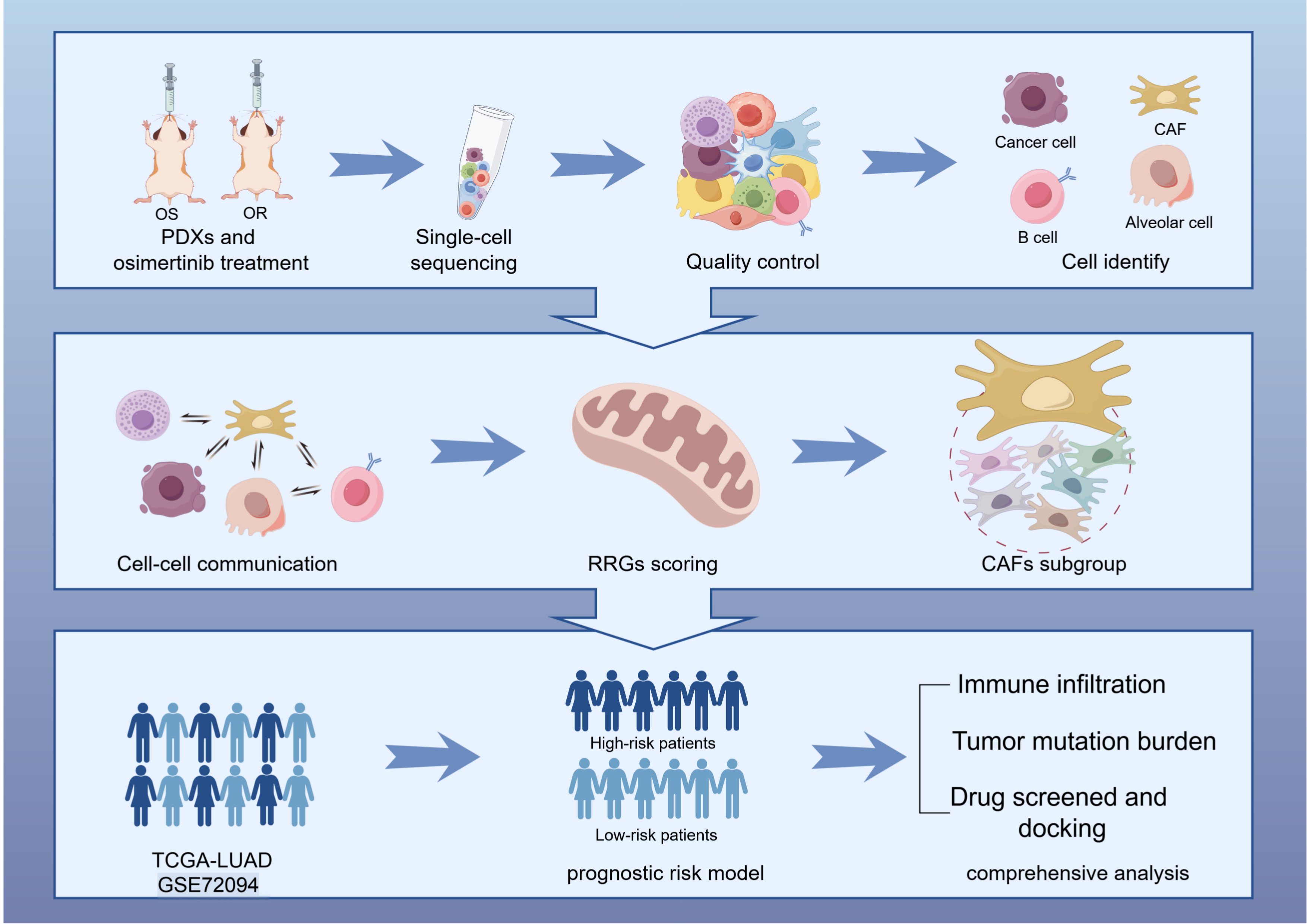 The scRNA-seq data GSE243562 were obtained from the gene expression omnibus (GEO) database (https://www.ncbi.nlm.nih.gov/geo/), using patient-derived xenograft (PDX) models of osimertinib-treated lung cancer. Samples GSM7790998 and GSM77901000 were classified as osimertinib sensitivity (OS), while GSM7790999 and GSM77901001 were classified as osimertinib resistance (OR). Bulk RNA-seq data were further acquired from the cancer genome atlas (TCGA)-LUAD cohort (https://portal.gdc.cancer.gov) and the GSE72094 dataset. Model development was conducted in the TCGA-LUAD cohort, with independent validation performed using the GSE72094 dataset. All datasets were standardized using R software (v4.3.0, https://cran.r-project.org/bin/windows/base/old/4.3.0/R-4.3.0-win.exe).