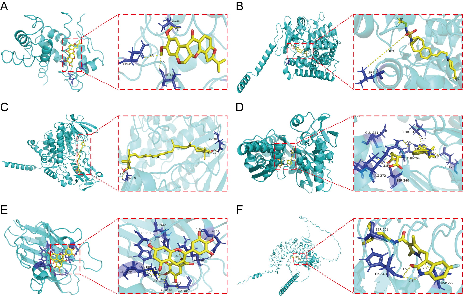 Fig. 10. Small-molecule docking to prognostic DE-RRGs. (A) Docking analysis of AGER in conjunction with rotenone. (B) Docking analysis of CYP2J2 in conjunction with MRK003. (C) Docking analysis of FMO2 in conjunction with lutein. (D) Docking analysis of the interaction of HSPA1B. (E) Docking analysis of SOD3 in conjunction with epigallocatechin gallate. (F) Docking analysis of VASN in conjunction with sunitiib.