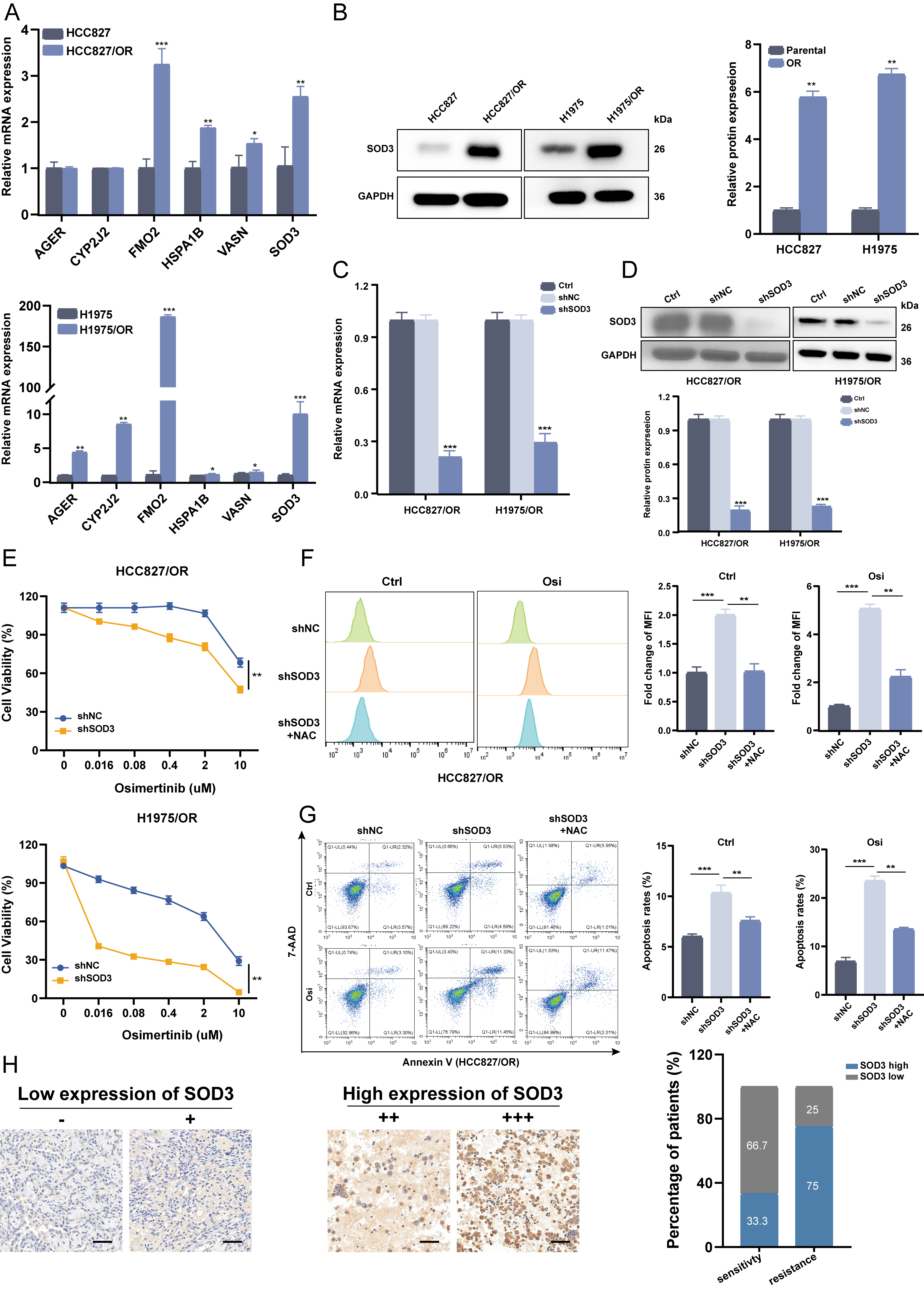 Fig. 11. Knockdown of SOD3 restored osimertinib sensitivity in vitro. (A) RT-qPCR was used to assess the mRNA expression of the 6 DE-RRGs in HCC827/OR, H1975/OR and their parental cells. (B) Immunoblot analysis of SOD3 proteins was performed on HCC827/OR cells and their parental counterparts, with representative images obtained from three independent experiments. (C,D) HCC827/OR and H1975/OR cells were transfected with SOD3 shRNA or shNC, and the expression of SOD3 was measured by RT-qPCR (C) and western blotting (D). (E) The viability of HCC827/OR and H1975/OR cells treated with osimertinib was determined by CCK-8 assay after SOD3 knockdown. Data are shown as the mean